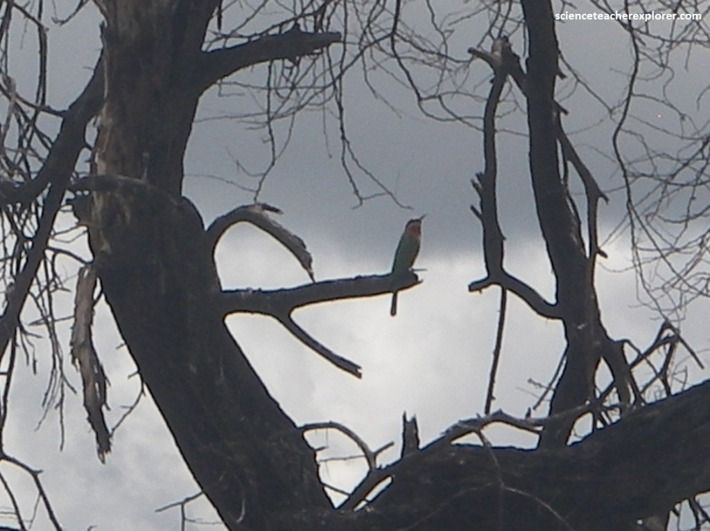 Pictured above, the white chin and forehand with the red throat is diagnostic to the White-fronted Bee-eater Merops bullockoides. The wings and tail were green and the vent and rump bright blue.