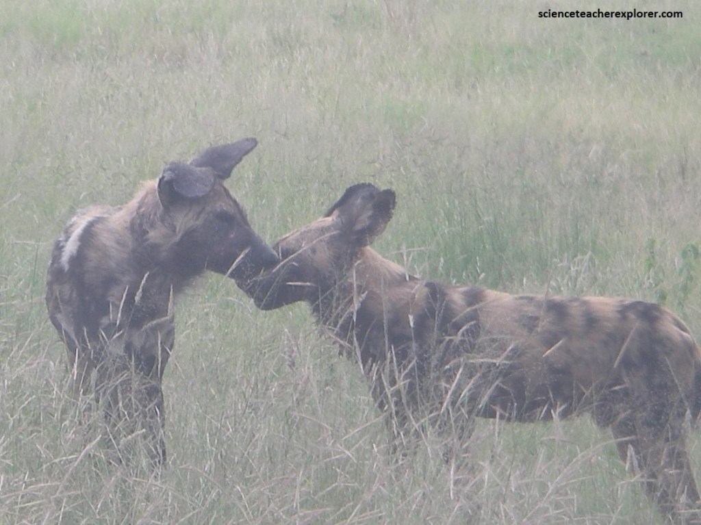 Pictured above, A couple of Wild Dogs Lycaon pictus seen along with a den of several on the H7 road near Satara. These were gregarious, animals with characteristic large rounded ears. Their coats were blotched yellow, black and white with the tip their tail white. They seem to hunt in packs and tears their prey apart. They were feeding off of a recent kill with a Spotted Hyaena nearby.