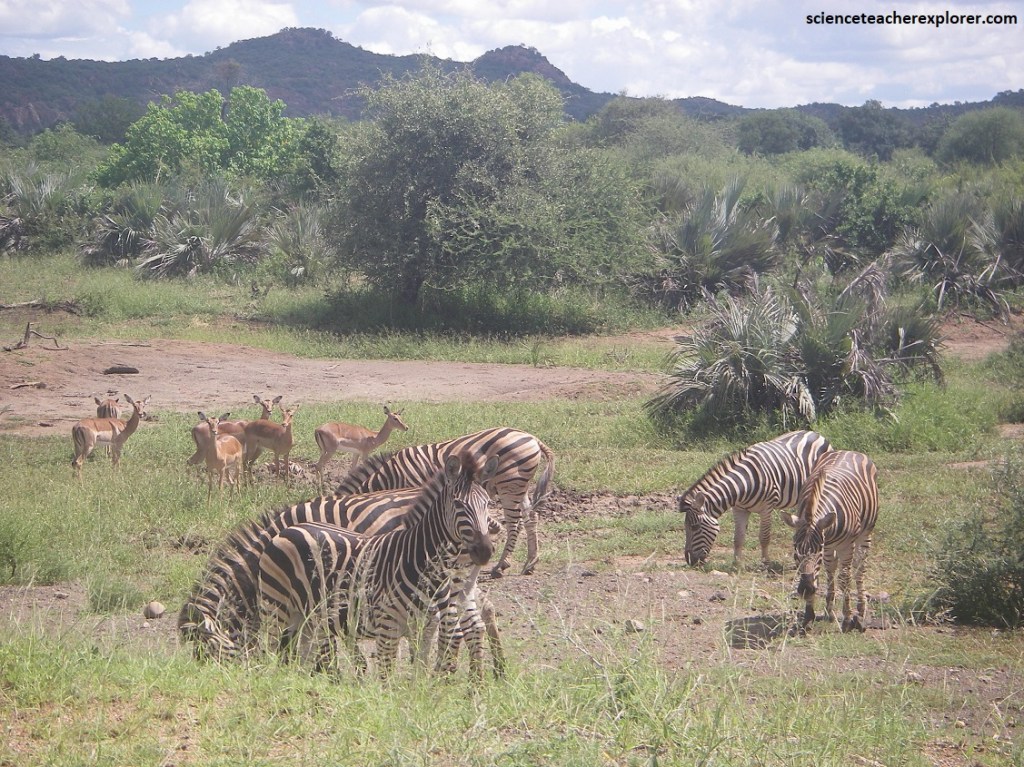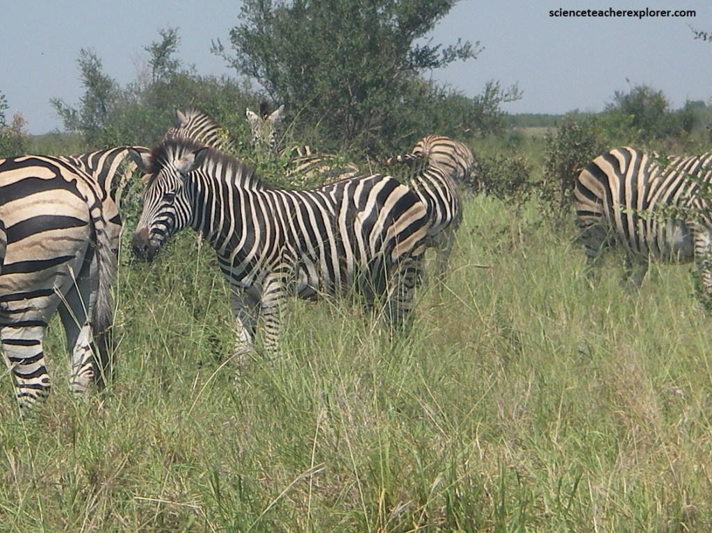 Pictured above, a herd of Zebras Equus quagga are horse-like animals with black and white stripes that extend to the belly. The stripe patterns serve as a “fingerprint” to each individual in the herd. Zebras never stray too far from water, but they never swim in it either. They prefer dust baths to clean themselves. Zebras can drink up to 14 liters of water a day,