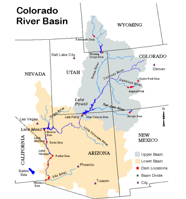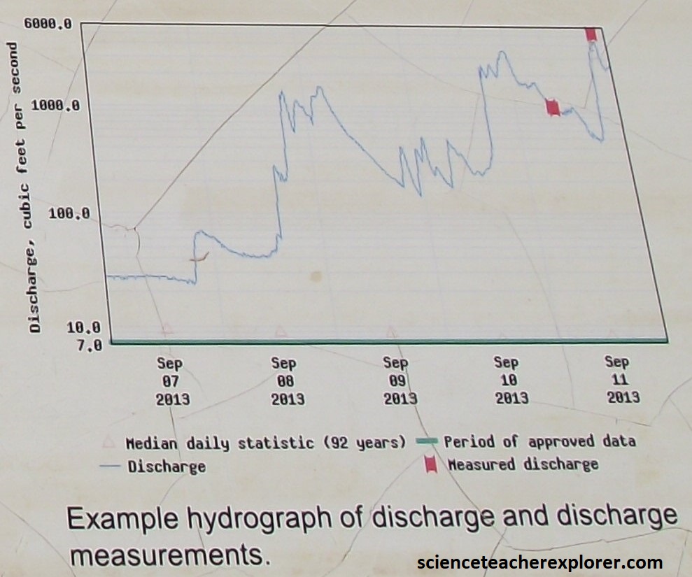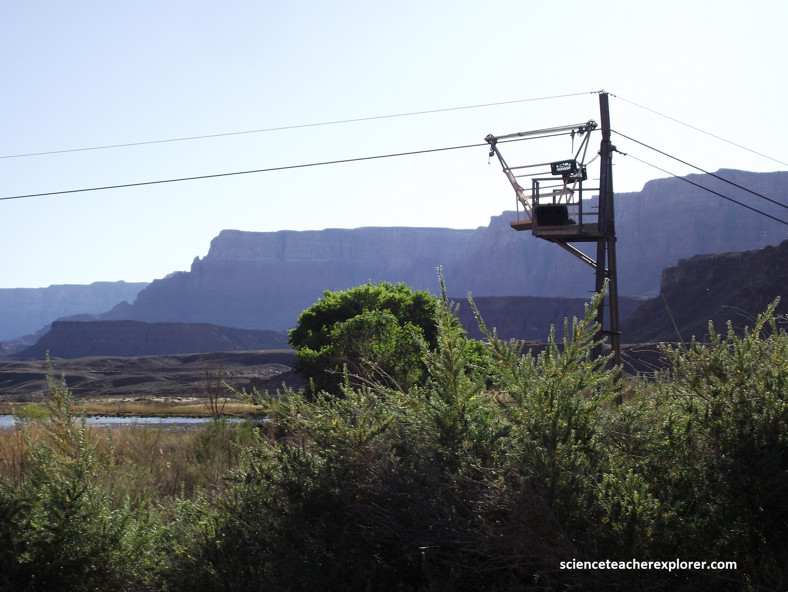Since 1921, the USGS has measured streamflow and water chemistry of the Colorado River using the Lee’s Ferry gauging station and cableway. For a Colorado River hydrologist, Lee’s Ferry is a line in the sand. It marks the legal boundary between the Upper and Lower River Basins, established by the 1922 Colorado river Compact. Since the Colorado River provides water for over 40 million people, this invisible line has fare reaching effects, extending to what you eat and drink. Water has always challenged people living in the arid Southwest. In the 1900s, California’s booming population led other states to fear priority water rights would go to the thirst Golden State. To ensure growing populations had a steady water supply, especially for agriculture, the seven Colorado river Basin states negotiated a deal. Each basin would receive 7.5 million acre-feet of water a year. [Note the cable stretching across the river to a gauging station, possibly the most important one on the whole river]. Continuous reading from that station determine dam operations nd uphold the Law of the River with stadia measurements. [Note: When the flow is too swift or dangerous for wading, hydrographers use the cableway system to make discharge measurements]. The particular system is an unmanned cableway which increases safety by allowing hydrographers to remain on the stream bank rather than place them directly over the water in a cable car. Discharge measurement data, and gage height data, collected at a streamflow gaging station, are use to define a rating for the river. A rating is the relationship between the continuously measure gage height and the regular measurement of discharge and ca be used to determine the discharge for any given gage height. Discharge data provides information for a variety of uses including water supply, flood warning, recreation, research, infrastructure design, and dam operation upstream.