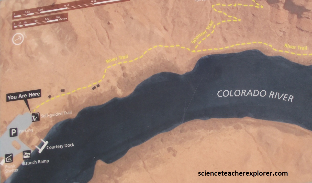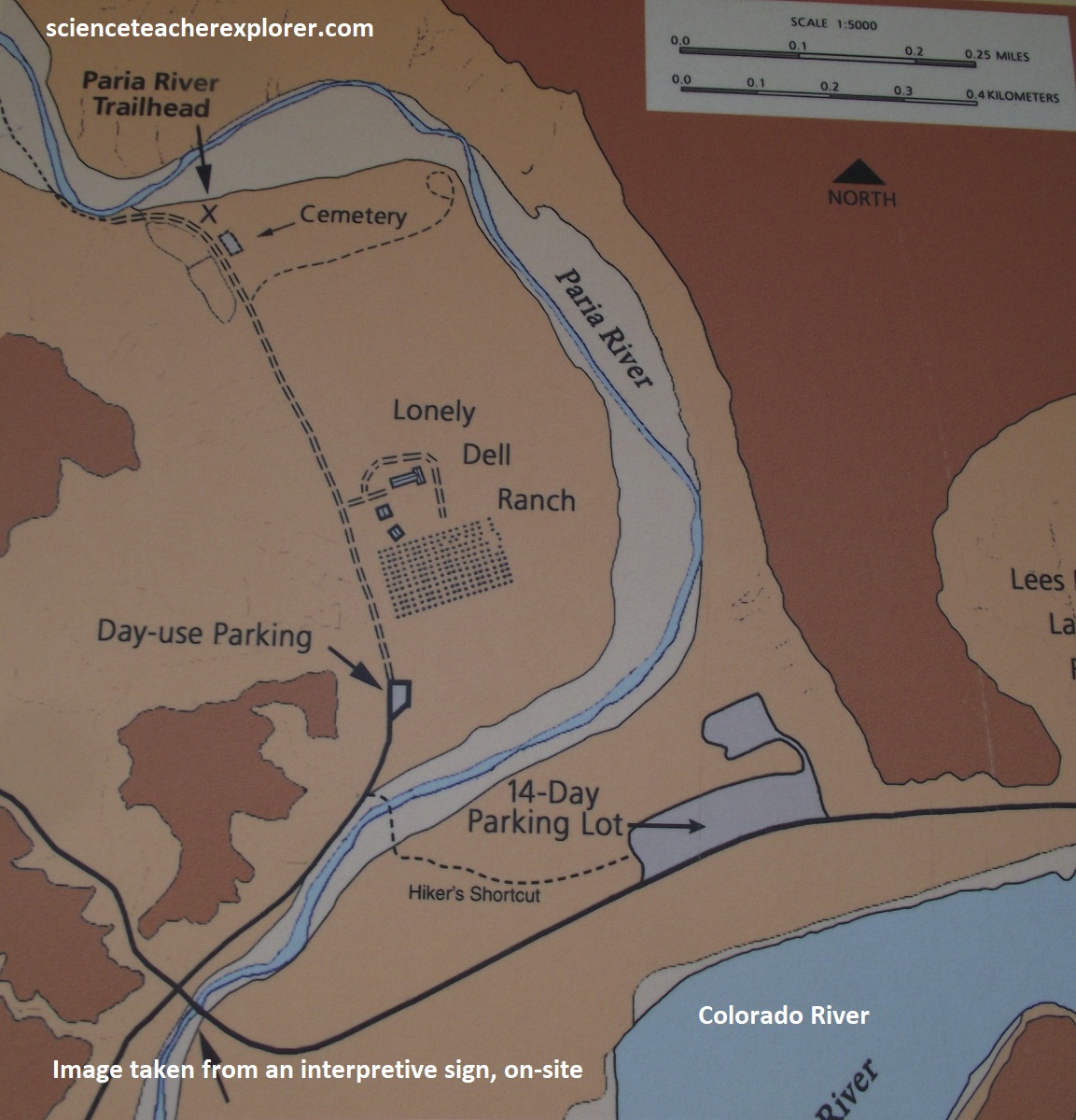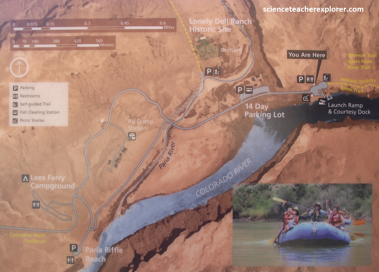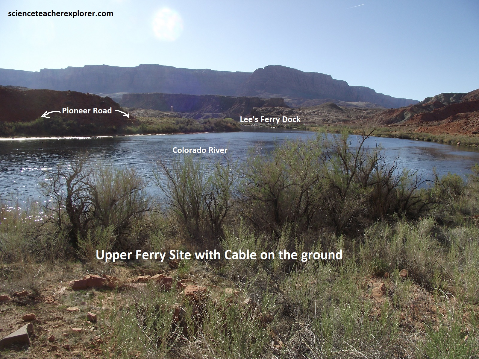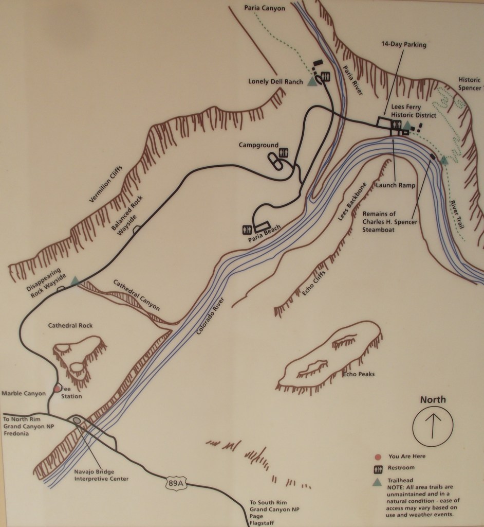 Imaged above, until the modern construction of bridges and dams, Lee’s Ferry was the only place a person could safely cross the Colorado River in more than 1,170 km of river. Imaged below, Lees Ferry Junction and Park Entrance is in Marble Canyon, just west of Navajo Bridge Interpretive Center. A paved road leads 8 km to the Ferry area.