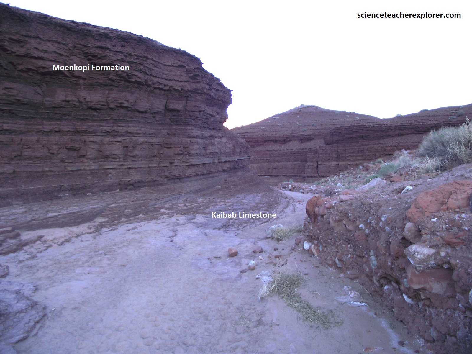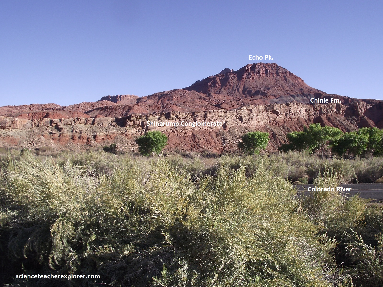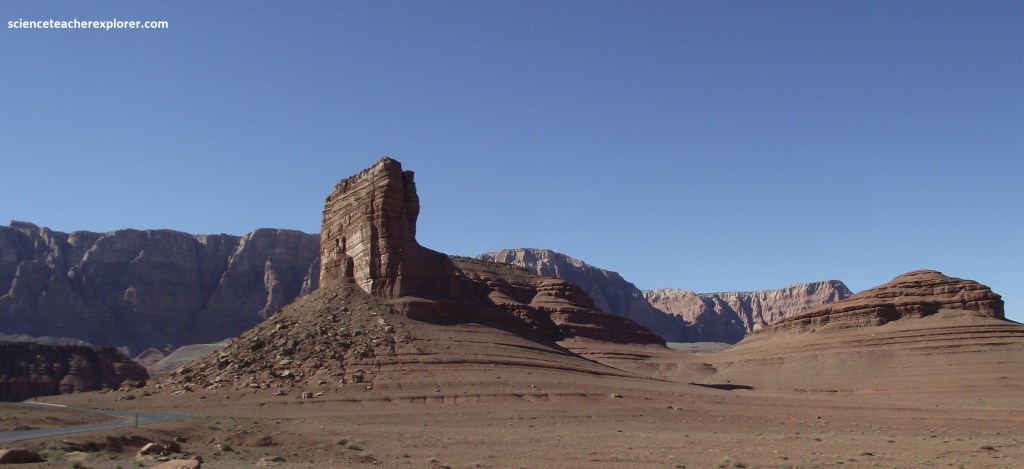 Pictured above is Cathedral Rock near Lee’s Station. It is an erosional remnant composed of red sandstone of the Moenkopi Formation, which was laid down during the Triassic. It is overlain by the resistant Shinarump Conglomerate caprock. The Moenkopi consists of two units, a thick lower unit of light red-brown thin-bedded silty shale and a thin upper unit of chocolate-brown limy shale and dark-brown sandstone; the formation is between 110-180 m thick.