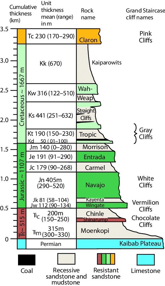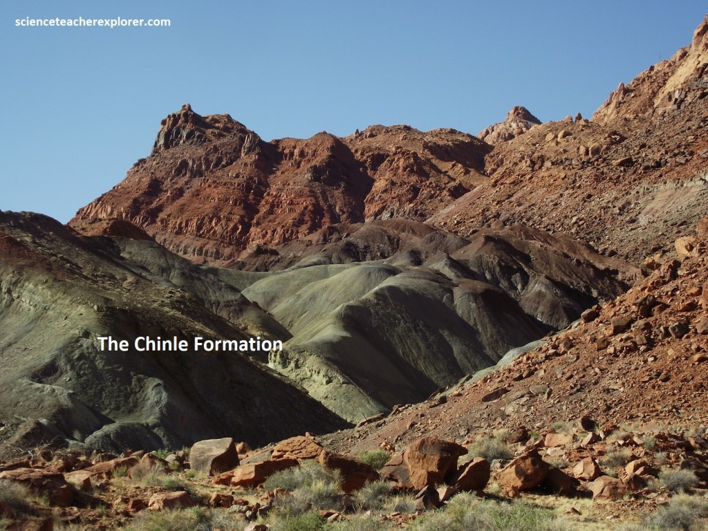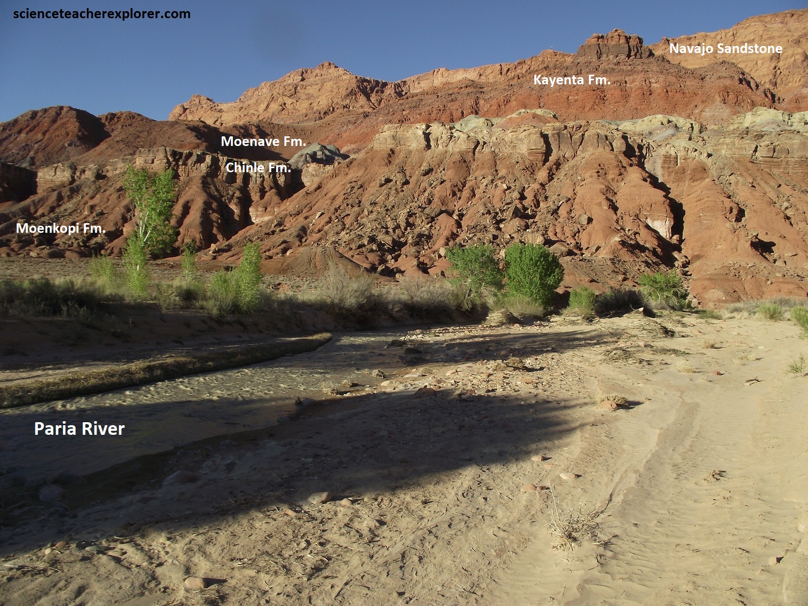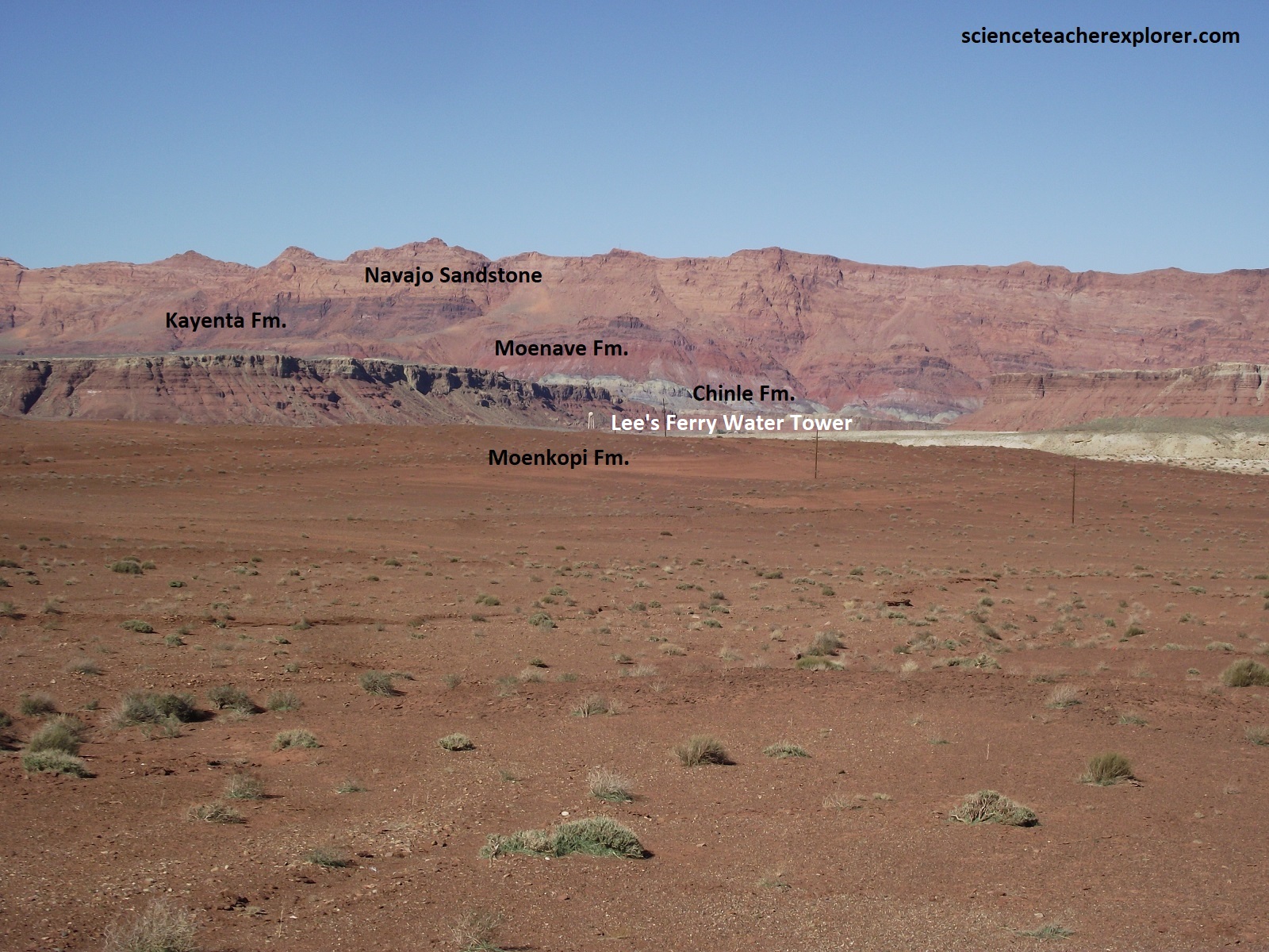Pictured above, The Chinle formation rests unconformably on the Moenkopi formation and is divided into the conglomeratic Shinarump member at the base, and Petrified Forest sandstone and mudstone unit above the Shinarump member, and a thick unit of mostly vari-colored mudstone that comprises the upper one-half to two-thirds of the formation. The thick mudstone unit has been subdivided into members in other parts of the Colorado Plateau, but for various practical reasons these units were not distinguished in the Lee’s Ferry are. The Chinle formation is between 330 and 380m thick in the Lee’s Ferry area. The cliff-forming Glen Canyon group of Triassic and Jurassic age overlies the Chinle formation and comprises rocks of the Moenave, Kayenta, and Navajo formations. The Moenave formation, unconformable upon the Chinle formations.