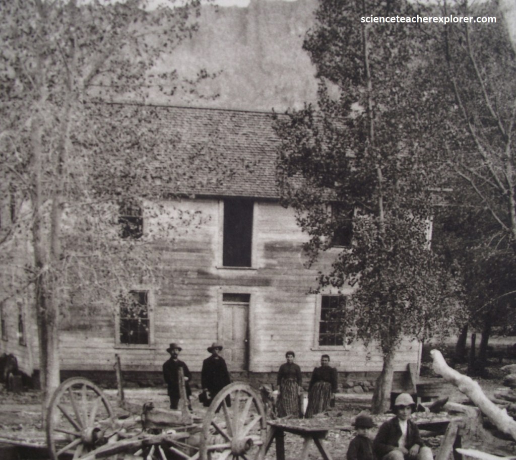 Imaged above, the ferryman Warren Johnson built a two story house for his families using proceeds from the ferry. They tore down Emma Lee’s cabin to make room for the new home, removing the last Lee Family structure at Lonely Dell. In 1897, new lead ferryman James Emett moved in with his family and added a wing to the house. The home continued to be the center of the ranch until consumed by a kitchen fire in 1926. Remaining wood and stone were used in other building.