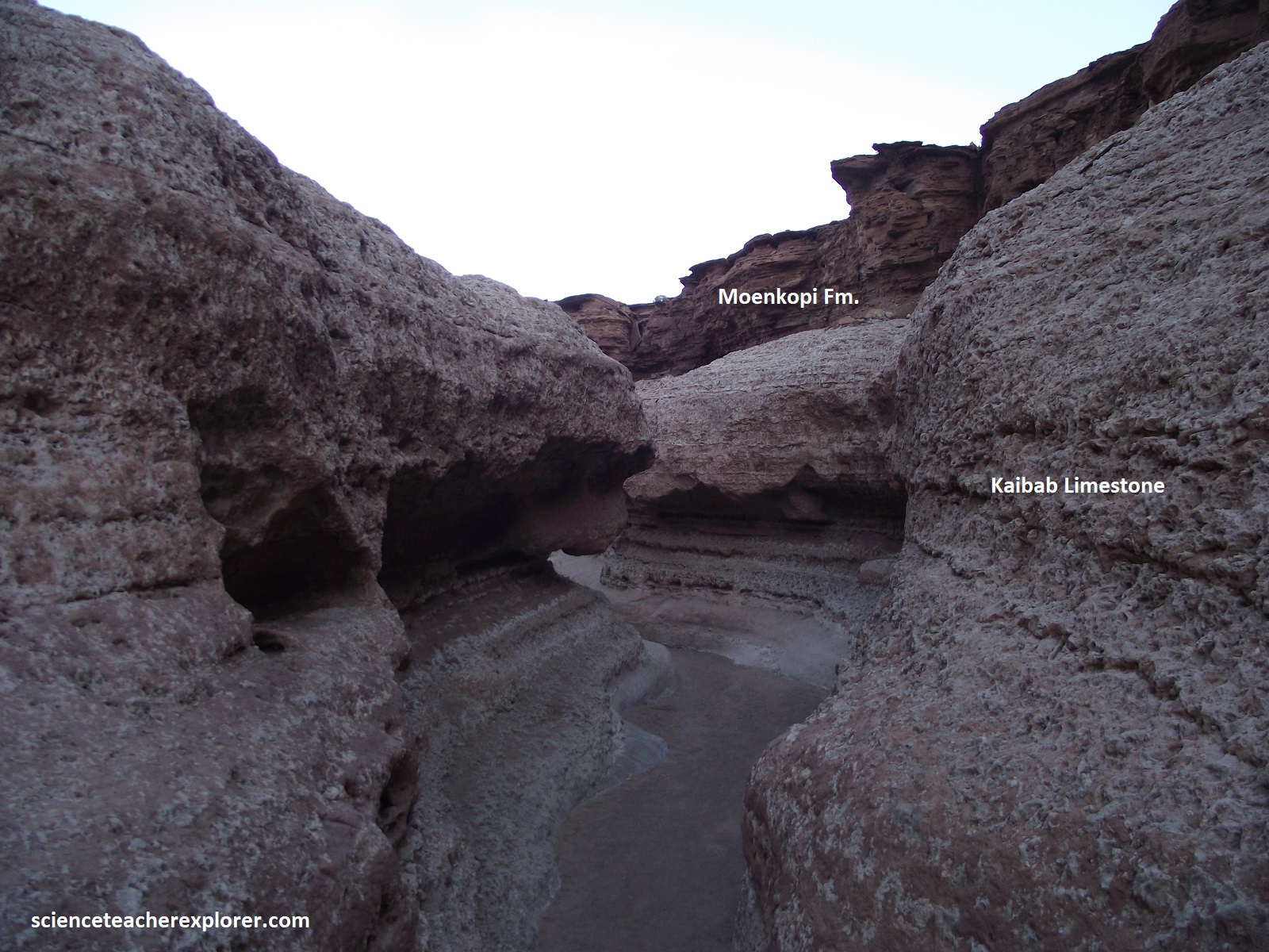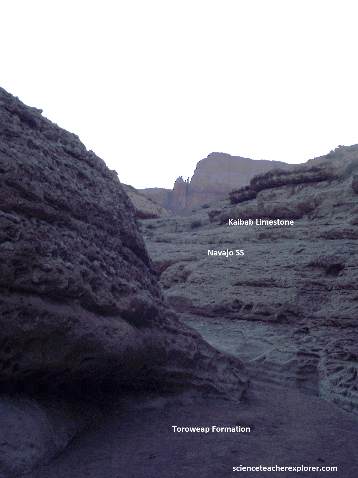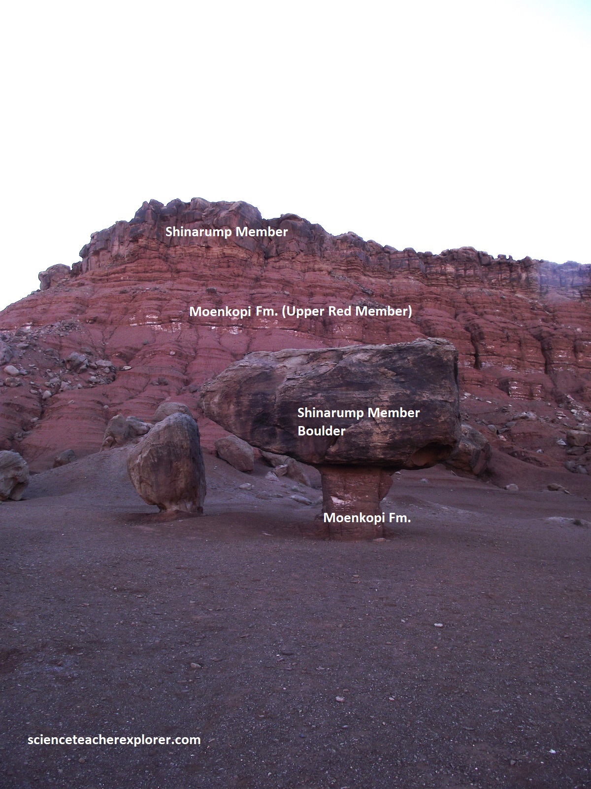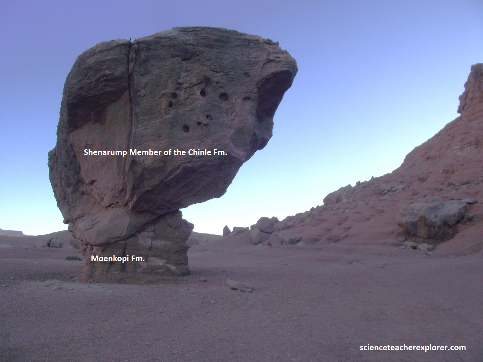 Just north of Cathedral Rock, is this balanced rock. Thousands of years ago a huge rock boulder broke from the cliff above and tumbled to a stop, (picture above). The hard conglomerate boulder compressed the softer dirt directly beneath, making it resistant to erosion. The boulder also acted as a massive umbrella, protecting the stone beneath from years of wind and rain. Over time, at least 2m of the surrounding loose ground was carried away, leaving an ever-growing pedestal with a balanced rock perched on top. The above Shinarump Conglomerate is Middle to Late Triassic, 227-225 million years old. The sands and gravels deposited by slow, meandering rivers then cemented together into highly resistant sandstone and pebble conglomerate, (at that time, Arizona sat near the equator in a tropical environment). The lower Moenkopi Formation is Early to Middle Triassic, 246-235 million years old. Mud and sand deposited on wide-tidal floodplains resulting in poorly cemented, thinly-layered mudstones and sandstones, (at that time, this area sat at the edge of a shallow inland sea covering present-day Utah.