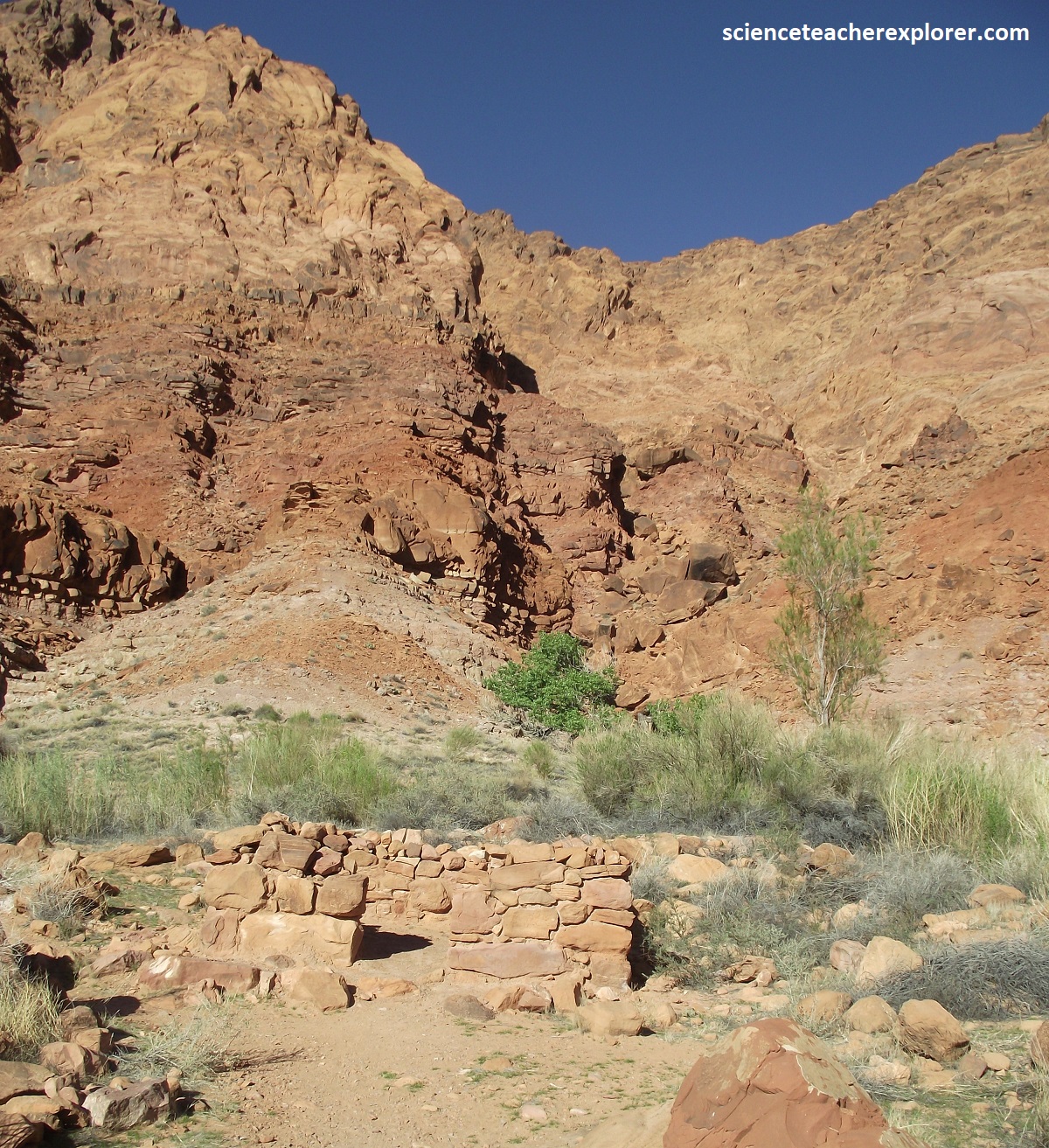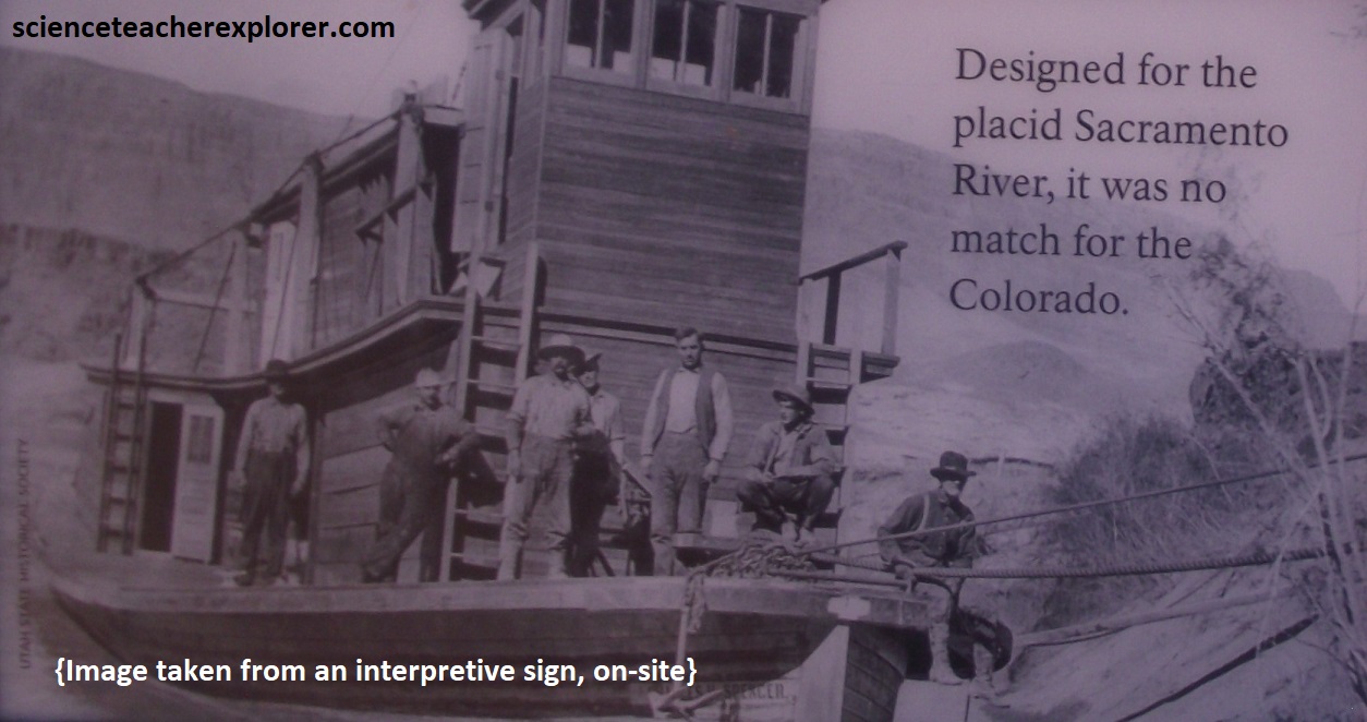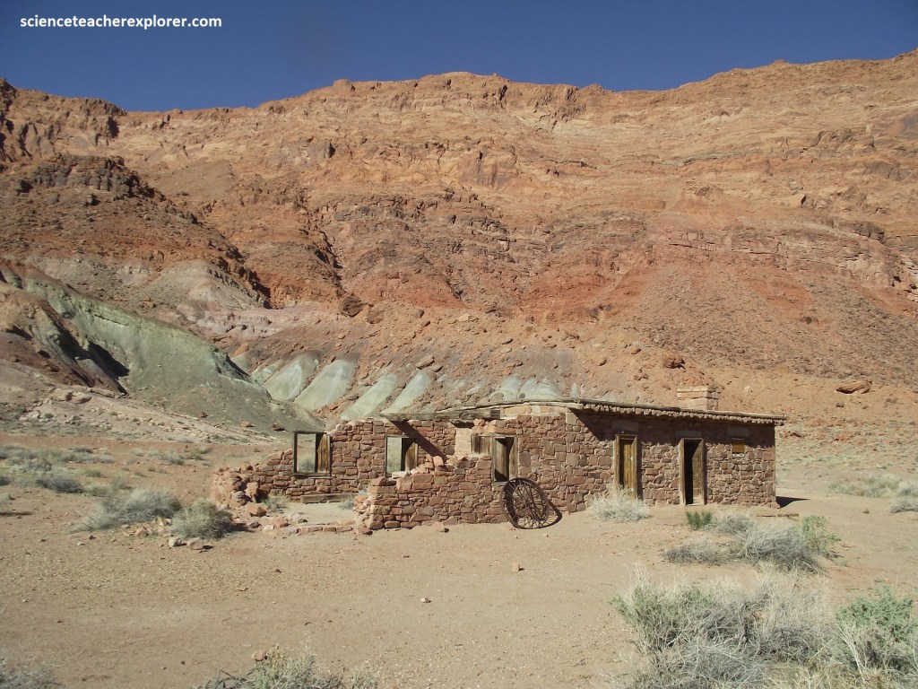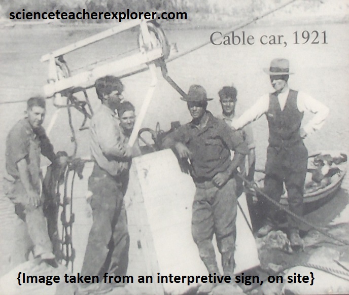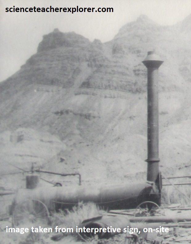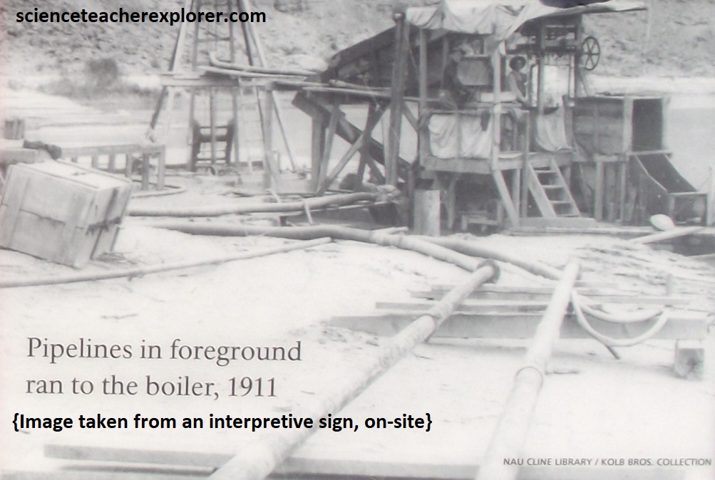 Picture above, Spencer moved the boiler to extract gold from the colorful Chinle Formation hills. He blasted water at the cliffs in high pressure hoses, washing sediments down a wooden flume to an amalgamator. Spencer used and amalgamator reliant on mercury to pull gold from the clay. Tests recovered a little gold, but also some other metal exhausting the mercury supply. In other words, this experiment failed too, as the gold could not be efficiently separated from the clay. Years later the mystery substance was identified as rhenium, (now valuable), useless at the time. [Even today, life at Lee’s Ferry means being self-sufficient, as evidenced by the area’s self-contained water system. Wells proved infeasible here, to the National Park Service draws water directly from the river, just like Spencer did. Of course, the park pump system is far more advanced and includes a water treatment plant for sanitation].