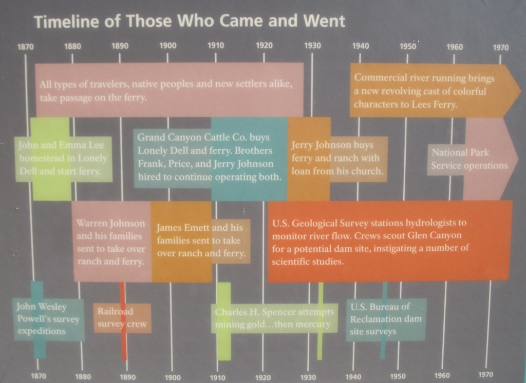 Surrounded by hundreds of kilometers of deep canyons, the Colorado River presents unimaginable barriers to travel. Over thousands of years, American Natives, explorers, and finally late-1800s pioneers found the end of Glen Canyon marked one of the only spots a person (or wagon) could reach the Colorado River from both sides. The Church of Jesus Christ of Latter-Day Saints established a ferry crossing here in 1872. John D. Lee was the first ferryman and namesake of the site. For 55 years, a variety of boats transported a variety of travelers across the Colorado River at Lee’s Ferry.