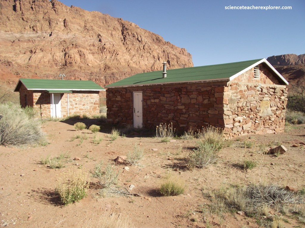 Pictured above is the United States Geological Survey (USGS) Guesthouse, built in 1950. The USGS established a presence at Lee’s Ferry as part of the Colorado River Compact, a 1922 water rights agreement. Using a cable car to measure the river’s flow, they ensured proper water sharing between neighboring states, The USGS constructed the guesthouse using stone from demolished Spencer buildings.