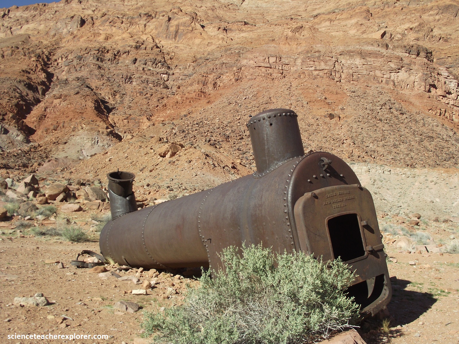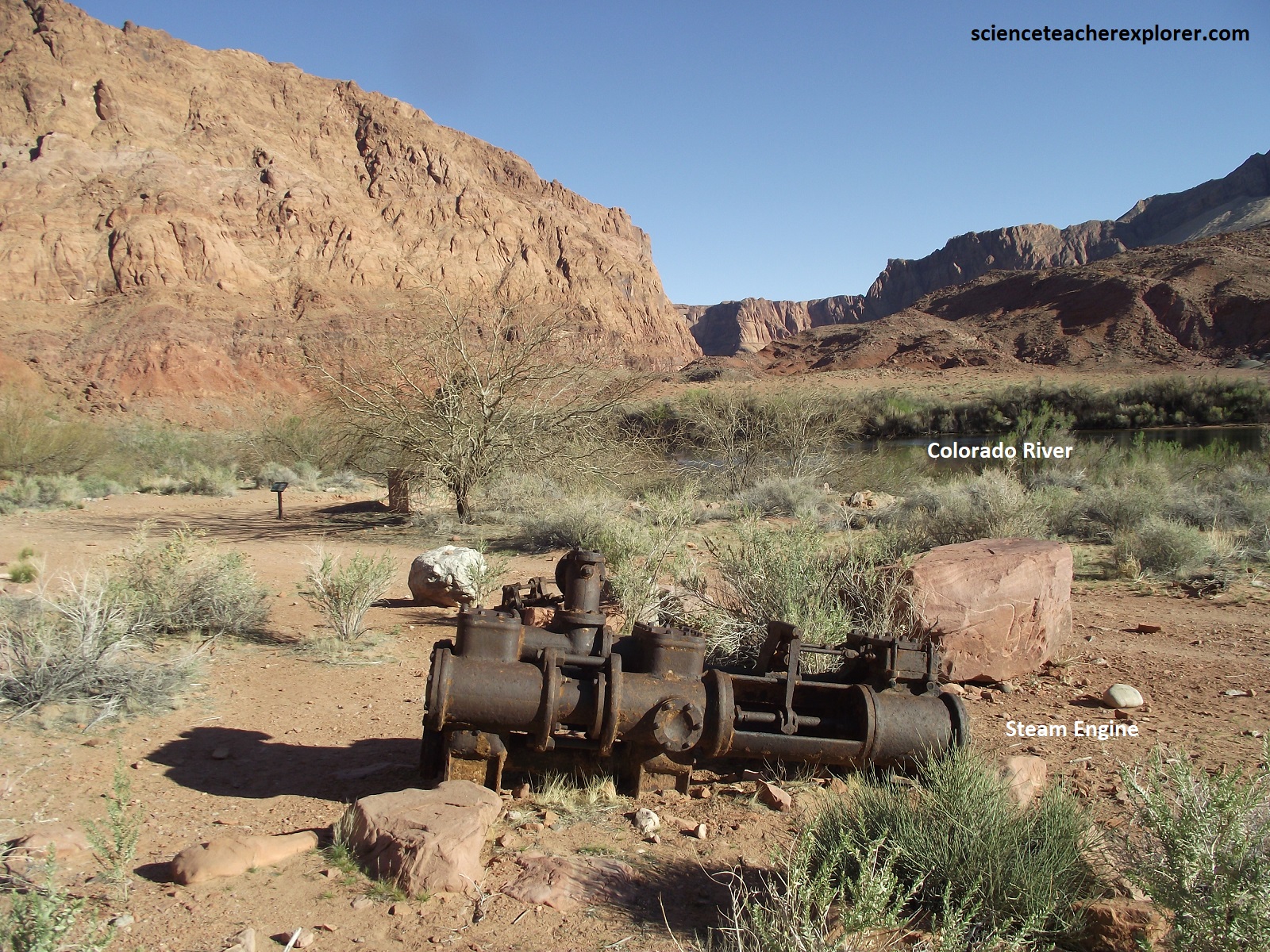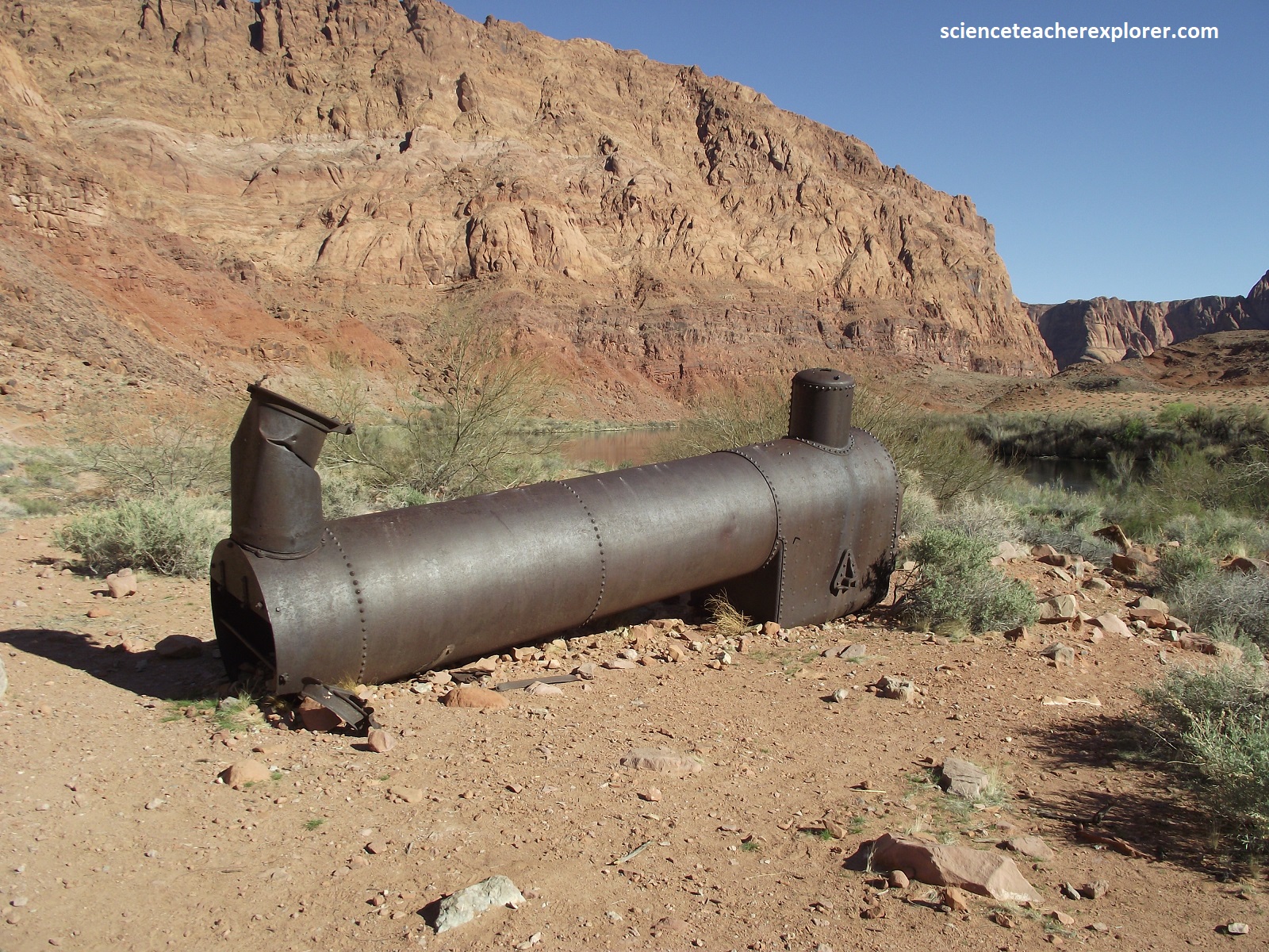 Pictured above, erected in 1910, is the Spencer Boiler the was hauled from Flagstaff, Arizona behind a ox-team. The Spencer Boiler was a Steam engine to pump water for Charles H. Spencer’s mining experiment. In his first attempt to extract gold, Spencer set up a pipe dredge across the river, The boiler produced steam that ran engines to pump water ad air down a pipe into the ground. Theoretically it would force sand and gold up through a casing. Unfortunately for Spencer, the pipe only went down a few feet before hitting rock. The experiment failed.