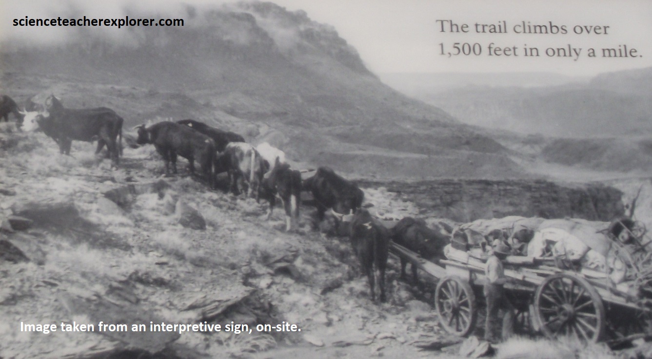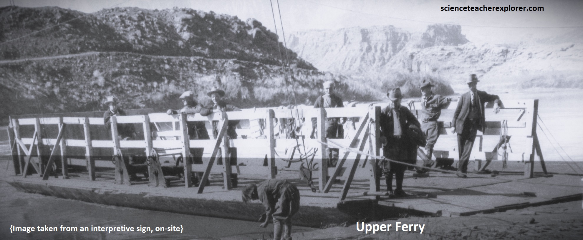 Until 1899, many pioneers crossed the river near the present-day boat dock, necessitating a harrowing wagon ride either up or down the unforgiving rock ledge known as “Lee’s Backbone”, (pictured above & below).
