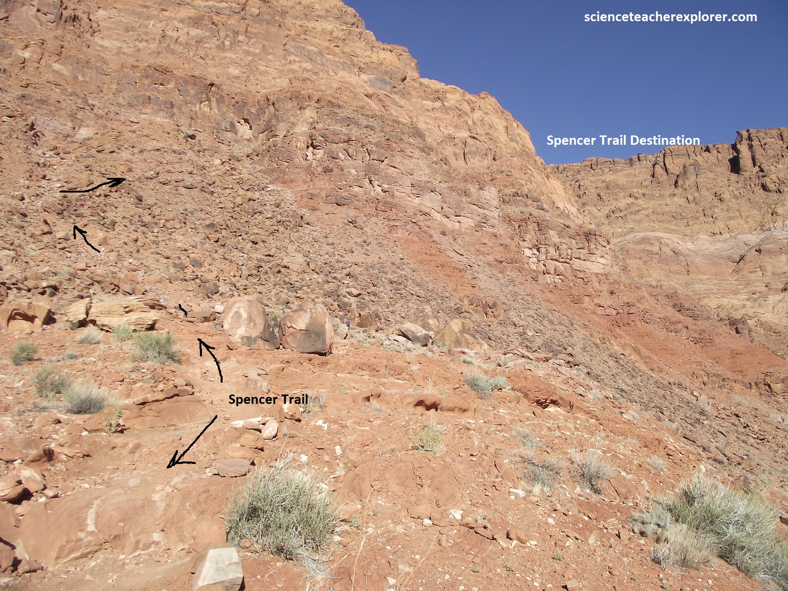 Pictured above, the Spencer Trail was built in 1910 for hauling Charles H. Spencer’s gold mining supplies. Spencer’s mining machinery needed fuel. As the rest of the miners hauled equipment to Lee’s Ferry, two men spent the fall of 1910 building a trail up this sheer cliff to a coalmine at Warm Creek Canyon, 48 km away. Pack mules carried several loads of coal down the trail later that year.