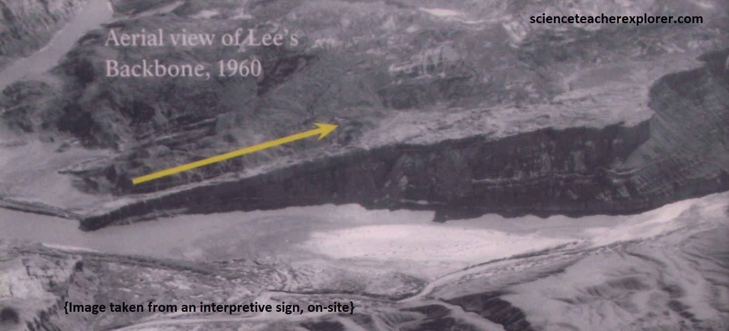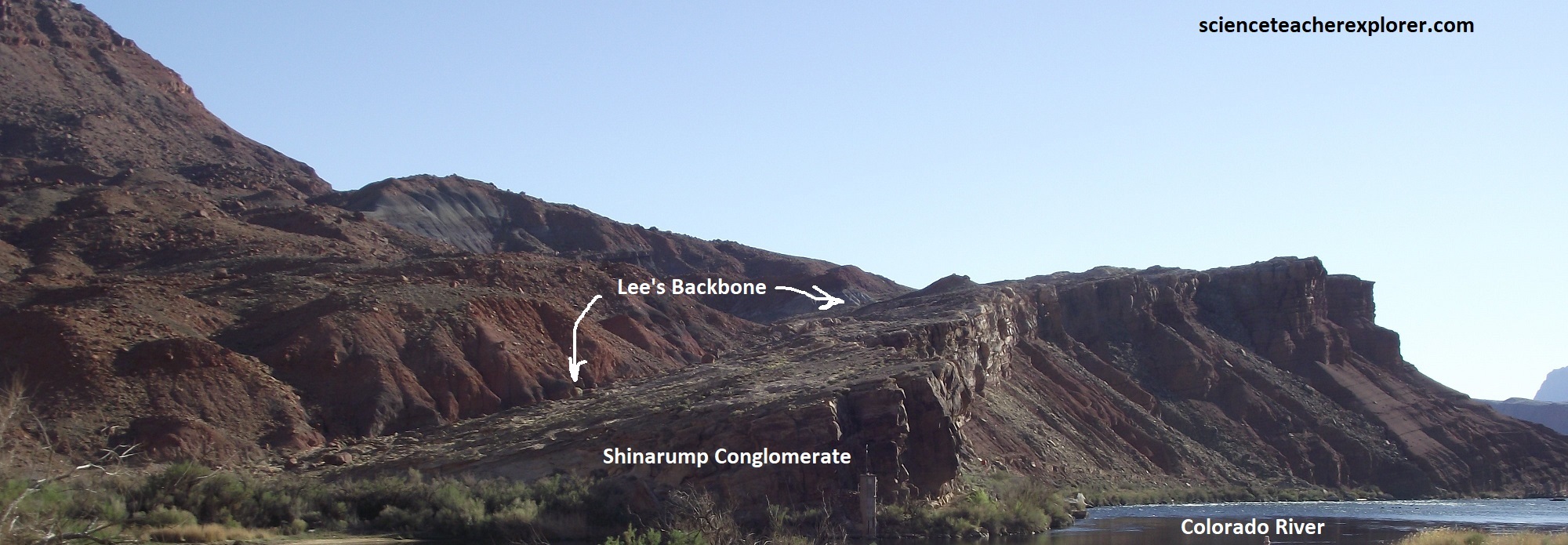 Pictured above, Lee’s Backbone is a rough, angled rock ledge on the opposite or South-side of the river back at Lee’s Ferry. Formed 225 million years ago, during the Late Triassic, a slow, meandering river laid down sand and rocks that were cemented into the hard Shinarump Conglomerate of the Chinle Formation. In most of the area, these oarse sdiments of te Shinarump Conglomerate are highly resistant to erosion, but they are only moderately well cemented by calcite and locally, chalcedony. [Note: A long dugway, or rough-cut road, later allowed travelers to avoid Lee’s Backbone. Pictured above, the road is still-visible across the river].
