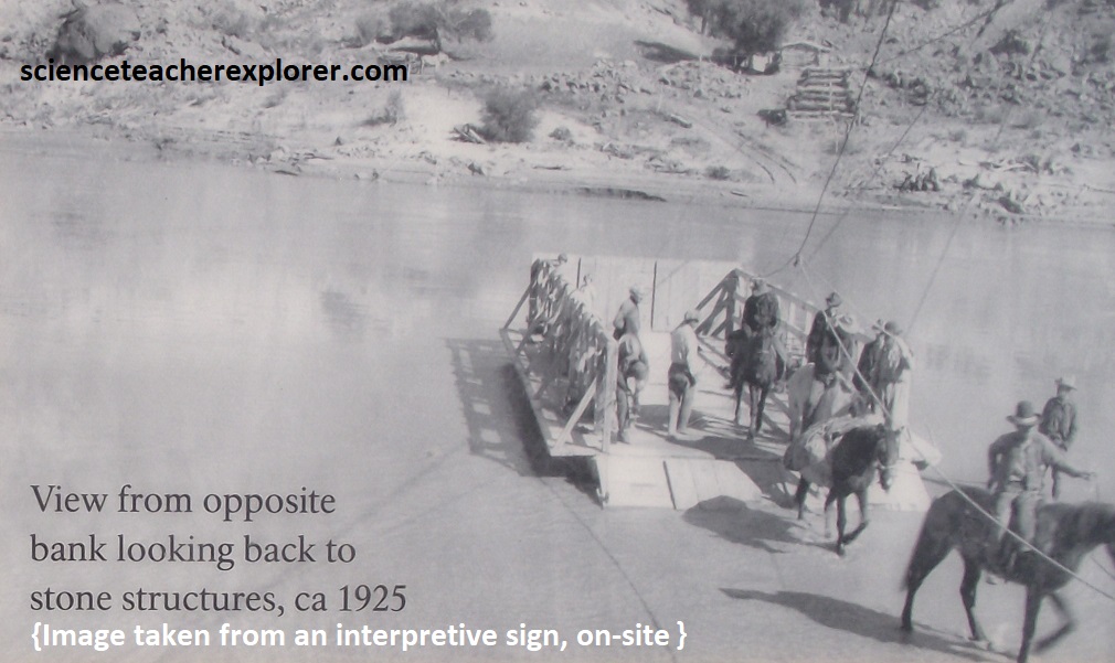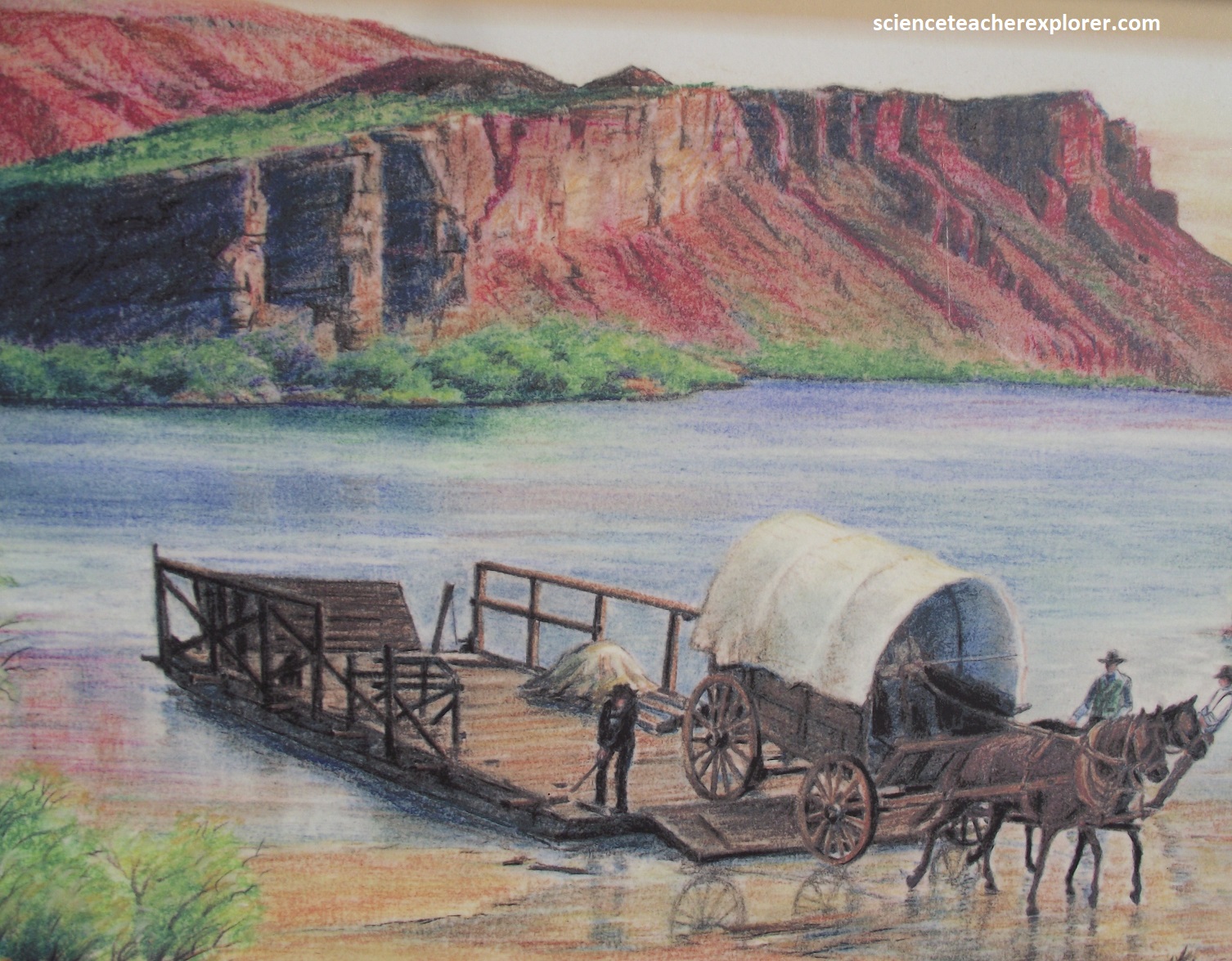 {Image above on the left is artist depiction of Lee’s Ferry that was found on an interpretive sign, on-site}