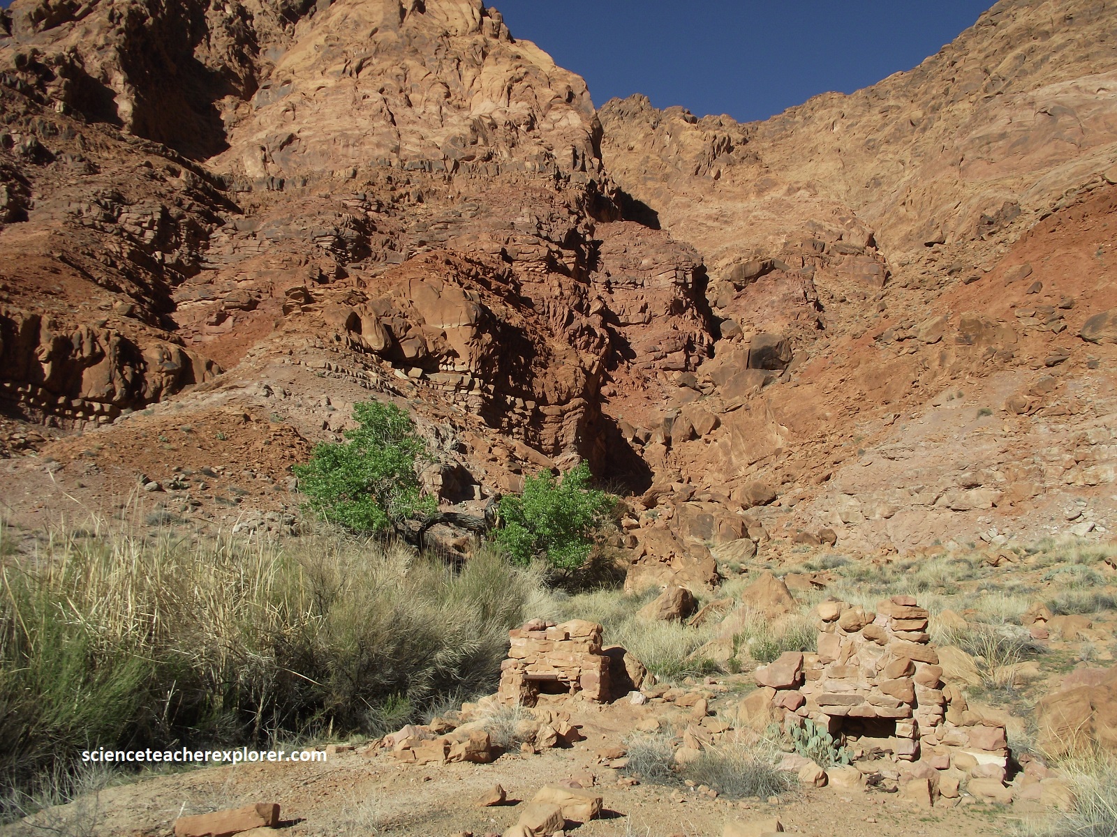 Pictured above, sporadic efforts to mine gold from the bentonitic mudstone in the Chinle formation near Lee’s Ferry were first made by Charles H. Spencer prior to 1913. According mineral-assayer Lawson (1913), samples of the mudstone averaged 2.5 -4 cents per ton of gold, but the metal defied all efforts for economic recovery, probably because it was too fine grained.