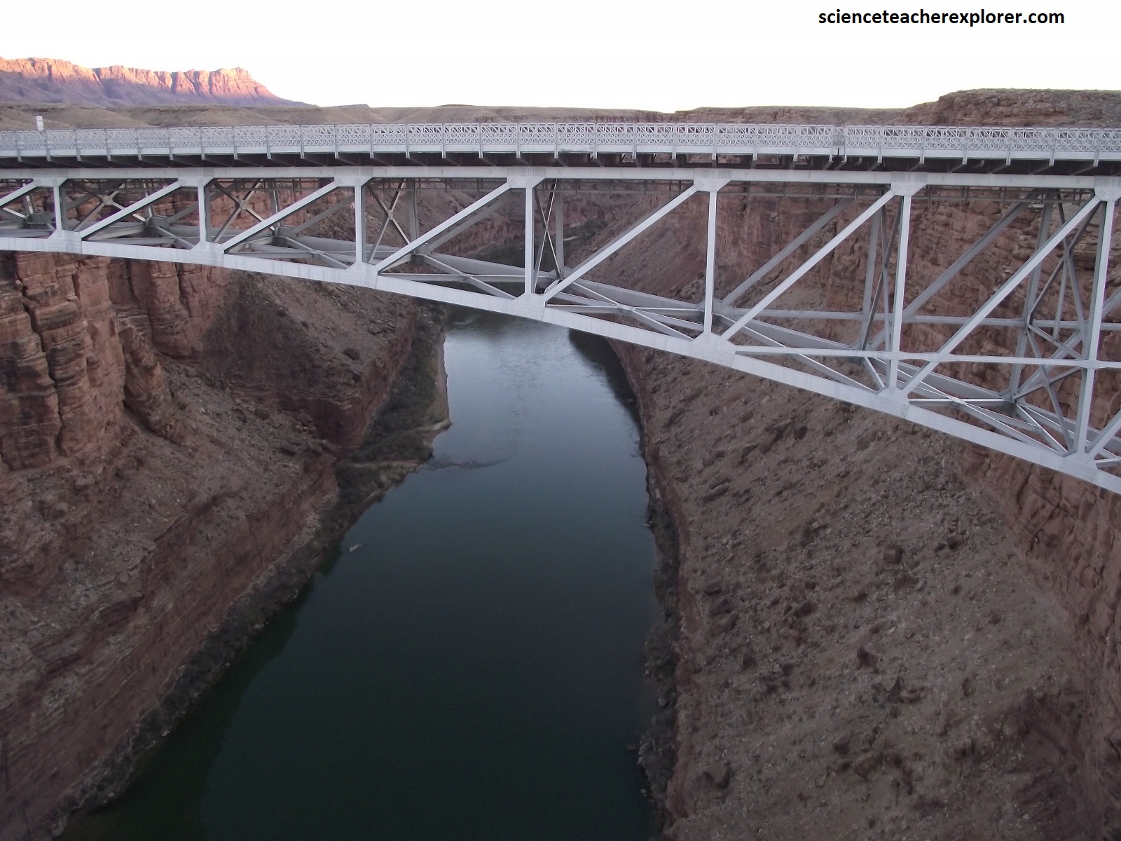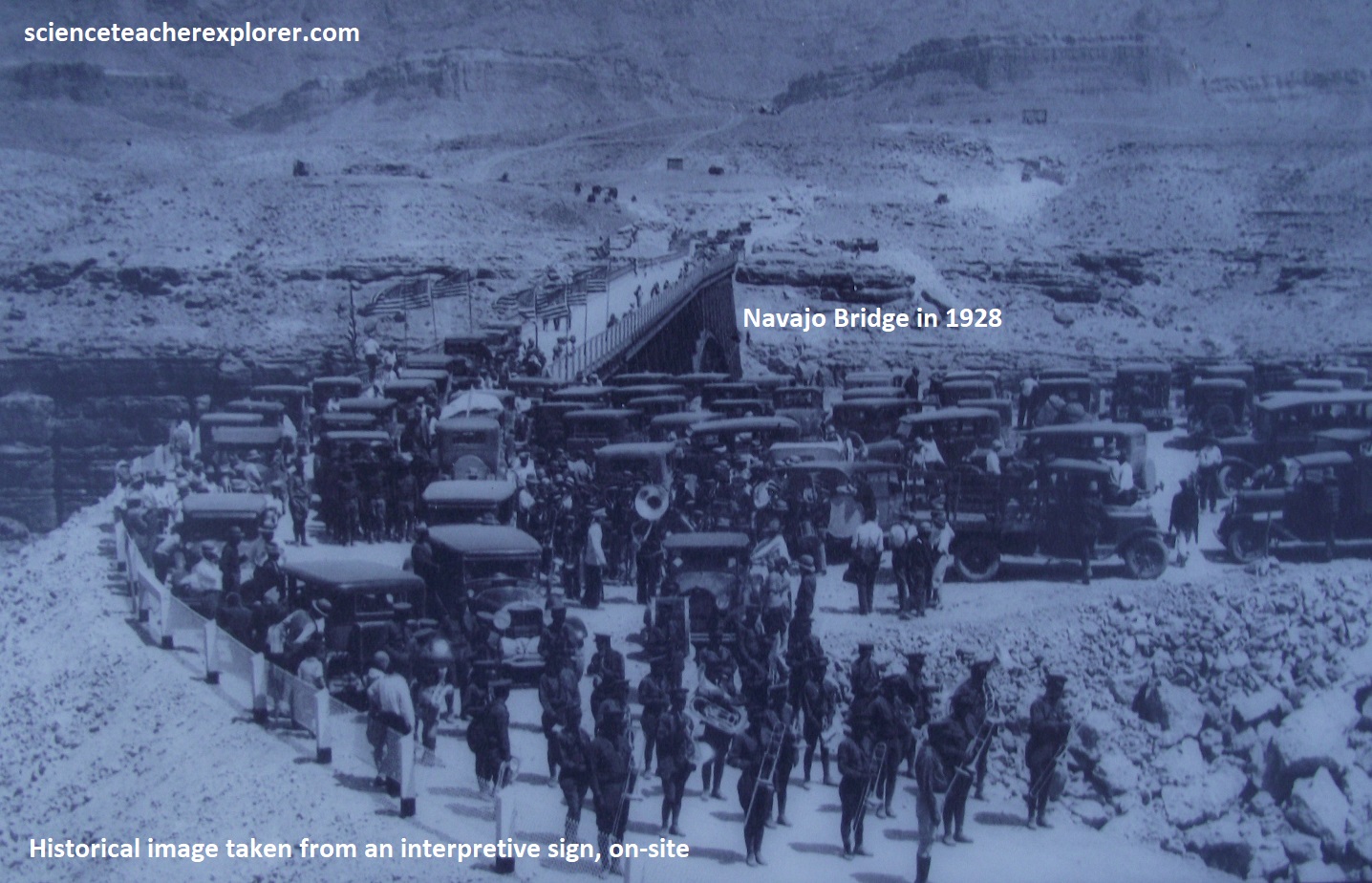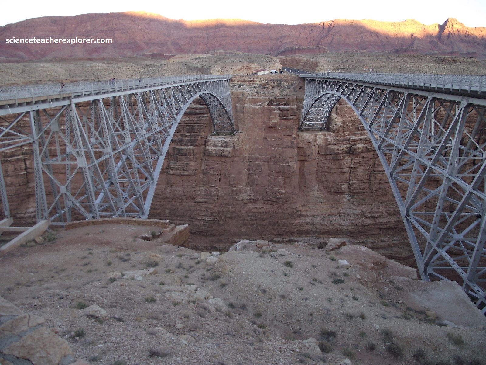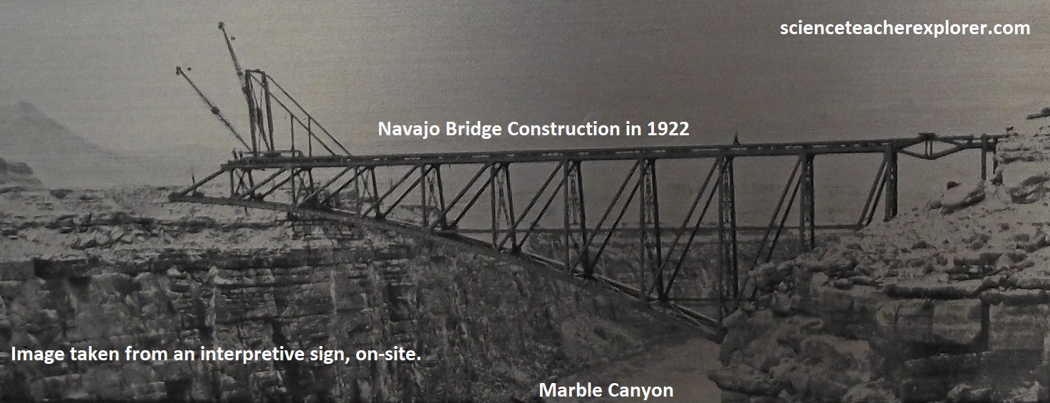 Picture above, the wider and longer modern Navajo Bridge maintains the important travel corridor, while addressing the safety hazards of it’s predecessor. Thou structurally sound, the original’s narrow deck, lack of sidewalks, and sharp curving approach amid spectacular scenery lea to a dangerous mix of car and pedestrian traffic. Still the original bridge engineers got plenty right. Computer modeling and seismic testing found no better bridge location than right alongside the first. The new builders could even take advantage of the extensive blasting and site preparation done in 1927-28.