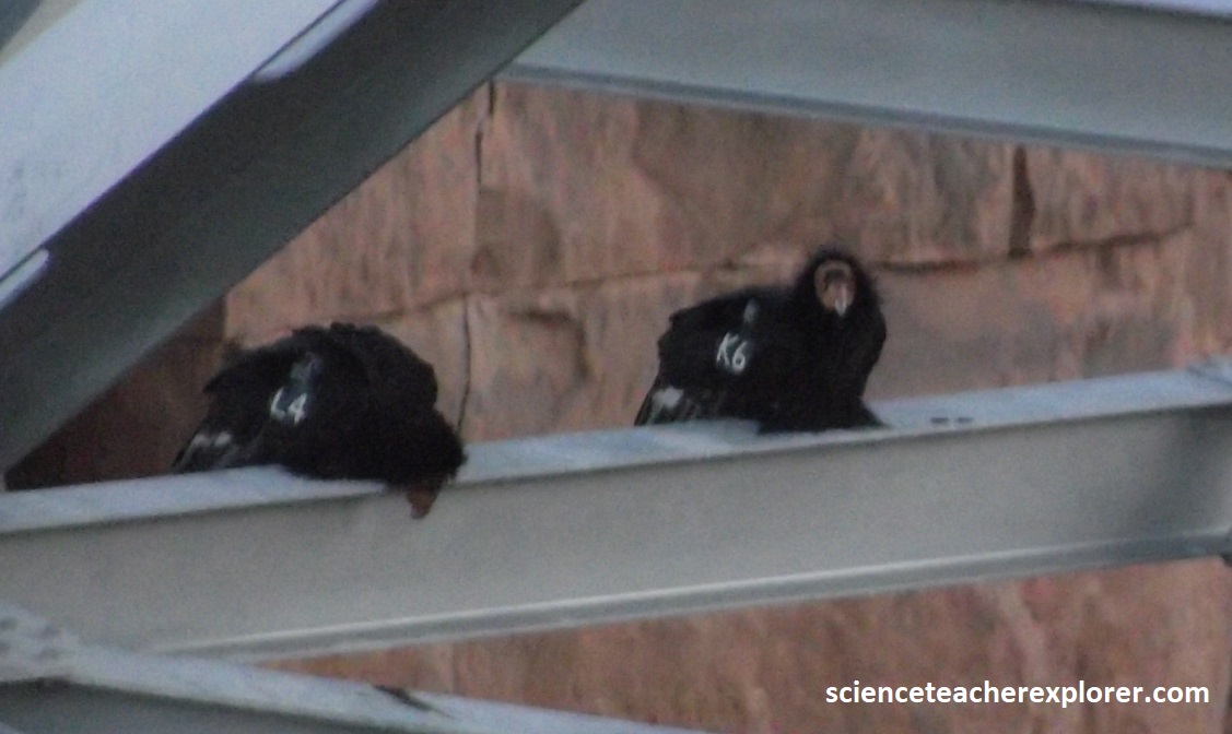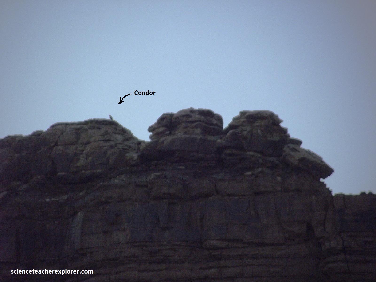 Pictured above, released birds have a radio transmitter and numbered tags attached to their wings, allowing biologists to identify and track every condor. The Picture on the left is one of the working biologists and the picture on the right is the adult condor watching below at for her young ones from the Vermillion Cliffs, (imaged below).