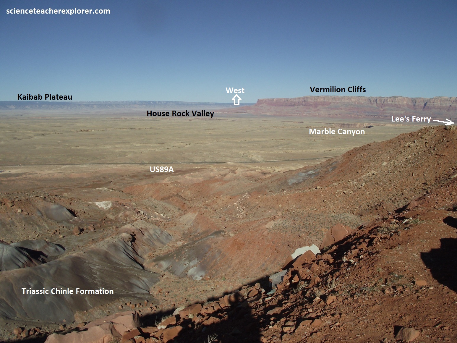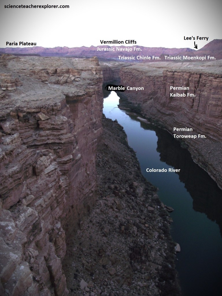 Pictured above, the Toroweap formation is composed largely of shallow-water near-shore deposits and the Kaibab limestone was deposited from the quiescent seas of the Cordilleran geosyncline that finally encroached as far southeastward as northwestern Arizona during Permian time (260 million years ago). The Kaibab limestone forms a widespread resistant surface that is trenched by the nearby Marble Canyon, and even older formations form cliffs or steep slopes on the inner walls of Marble Canyon, (southwest of Lee’s Ferry).