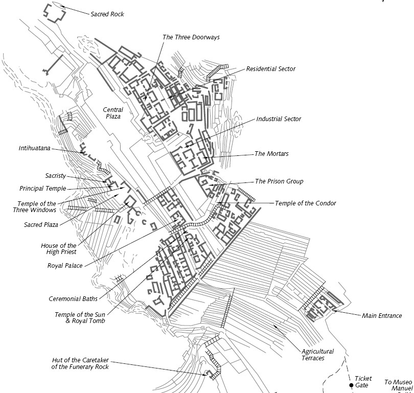 Notice the similar form of the carved and polished “Sacred Rock” and the Muchu Picchu Mountain to the north. It strengthens the theory of mountain worship.