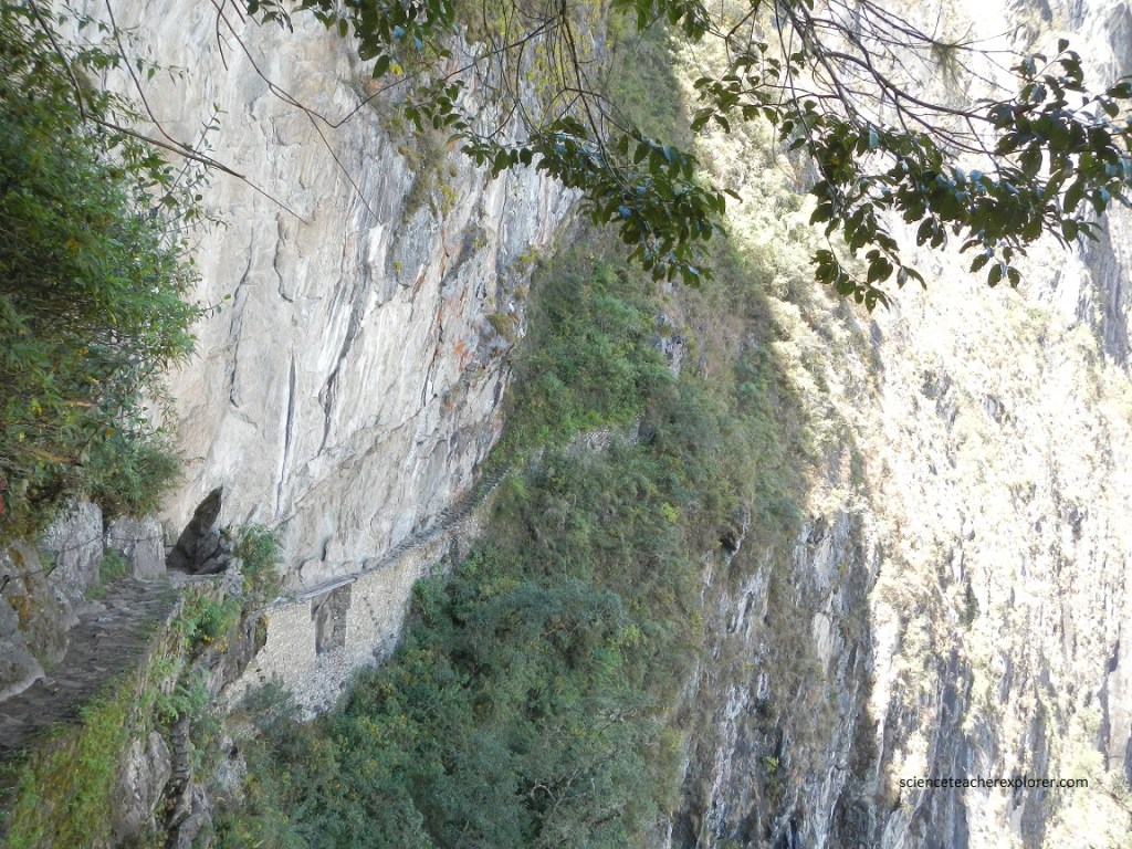 There is subsidiary Inca Trail from Machu Picchu that formerly went all the way down to the Urubamba River. Now it only leads to what is know as the Inca Drawbridge, the shortest and easiest side trip. The picture above is a good view of the “bridge”, an ingenious rock wall protruding from the face of the sheer, 400m cliff of the Machu Picchu Fault, with a strategic gap. There are timbers across the gap where Inca security-guards could simply remove them to make this route to Machu Picchu virtually inaccessible.