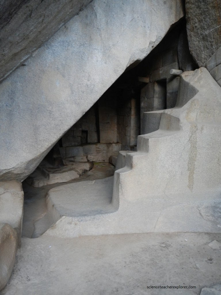 Pictured above, beneath the Temple of the Sun is a natural cave, part of the same rock formation. Note the exquisitely carved, stepped white stone at the entrance; the low carved stone on the floor with a shape similar to the Intiwatana stone; the unusually high niches; and the stones between the stepped stone and the natural rock on the left, carefully fitted into an hourglass shape, (not seen in the photo above). Additionally, attached to the Temple of the Sun is a small building often called “Nusta’s Bedroom”. This might have been the house of the high priest.