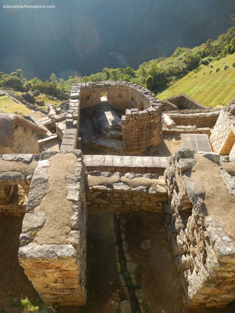 The “Temple of the Sun” is constructed on a natural rock formation and partially encircles the top of that specially cut rock formation with the finest stonework of Machu Picchu, (picture above). The sacred rock that takes up most of the space inside the curved wall was honored and protected by the Inca masonry that surrounded it. The straight ledge, which was created by cutting away part of the rock, bisects the sunlight passing through the eastern window at sunrise on June 21, the winter solstice. Therefore, the “Temple of the Sun” can be considered a solar observatory. Note that the south window with its four stone protuberances were likely used for astronomical/observatory purposes also.