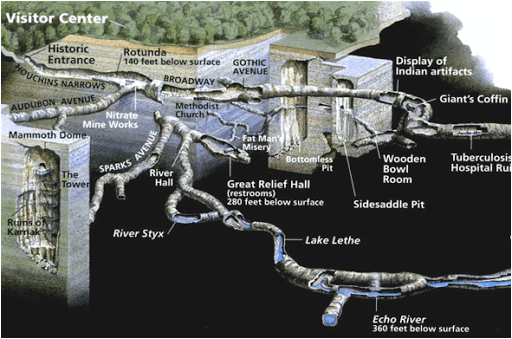 However, Mammoth Cave contains mostly of a long series of subterranean rooms and passageways. They twist and turn like strands of spaghetti, waving their way through the Earth’s crust. Some rooms are enormous and some passageways are just large enough for a small person to squeeze through.