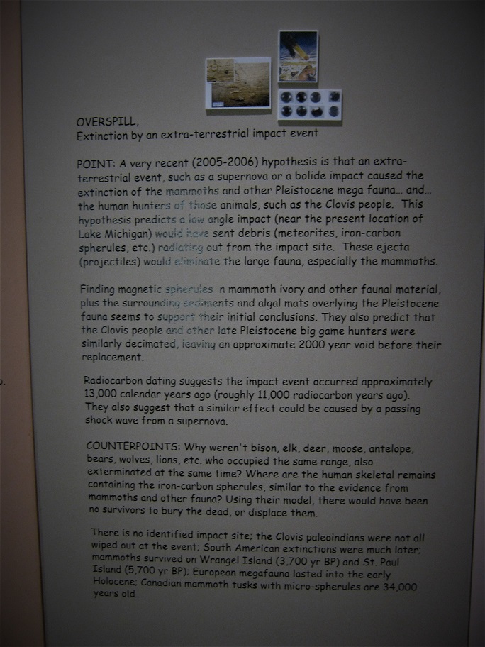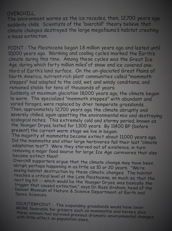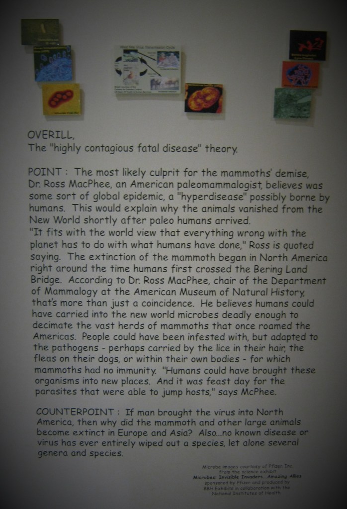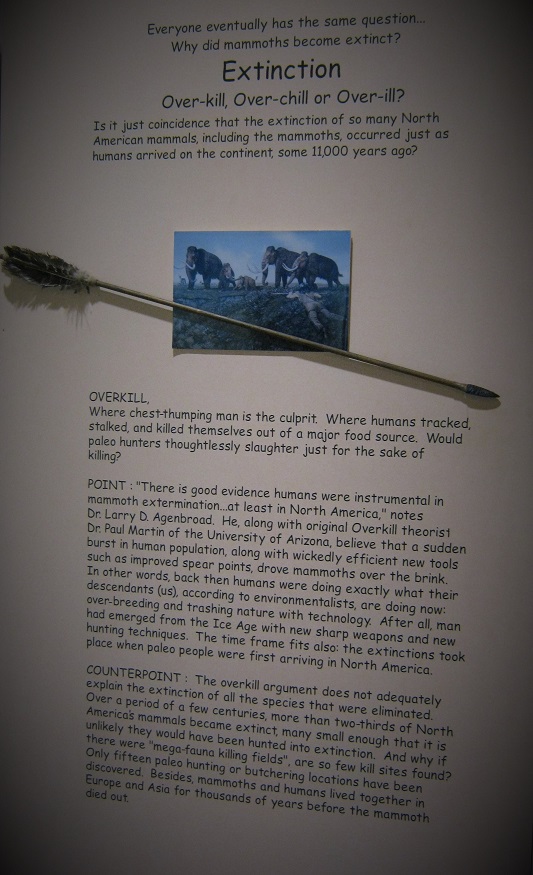 What caused the extinction of the Mammoth. I found an educational interpretive site that summarizes the current theories. Since they are presented at the Museum of the Mammoth Site in Hotsprings, South Dakota; it makes them public domain and below are images of the theories.