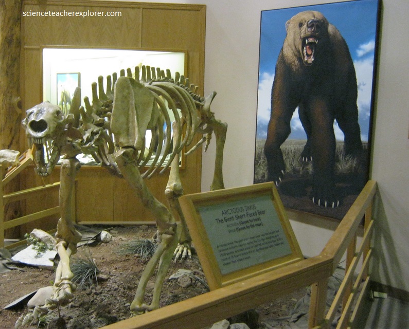 This 26,000 year estimate was made on the basis of the faunal remains that are found in association with the mammoth remains. The presence of the remains of Pleistocene bear, camel, antelope, and shrub-ox indicated to geologists and paleontologists that sinkhole at this site might be filled with Late Pleistocene, possibly terminal Pleistocene, sediments. Pictured below, the Hot Springs Giant Short-Faced Bear, was an adult male, in the prime of life. Thus far, they have discovered no trauma, or cause of death for this individual. He may have tried to dine on a not-so-deceased mammoth and was crushed by his intended meal ticket. Detailed studies of these bones and teeth at this site, have led researchers to conclude the short-faced bear was a large (1.5 m in a quadrupedal stance), opportunistic scavenger which occupied the open grasslands.