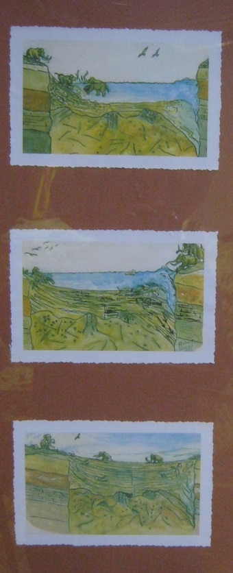 Likely enticed by warm water and pond vegetation, mammoths entered the pond to eat, drink or bathe. Because of the steep sides of very slippery Spearfish Shale, mammoths were occasionally trapped as they were unable to find a foothold and climb out of the sinkhole during periods of low water. Trapped in the sinkhole, the mammoths ultimately died of starvation, exhaustion, or drowned in the pond. Cross-section of mammoth footprints at the Mammoth Site. Eventually the sinkhole filled, and the artesian spring diverted to the lower elevation of Fall River, as the river cut deeper in the valley floor. Over thousands of years, the “hardened mud plug” inside the dried-up pond has remained stable. The surrounding sediment was subsequently eroded, leaving the sinkhole as a high point on the landscape.