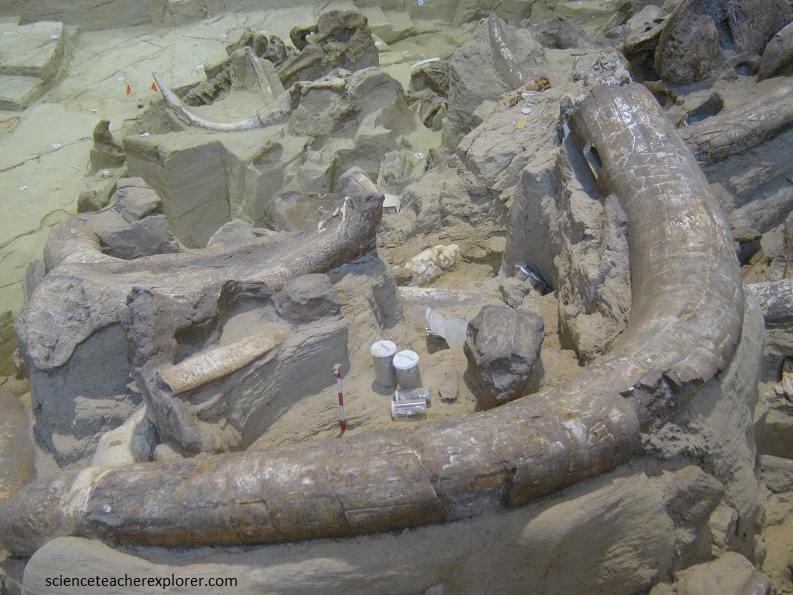 The area of Mammoth Site of Hot Springs enclose a prehistoric sinkhole that formed and was slowly filled with sediments during the Pleistocene era. The sedimentary fill of the sinkhole contains the remains of Pleistocene fauna and flora preserved by entrapment and burial within a sinkhole.