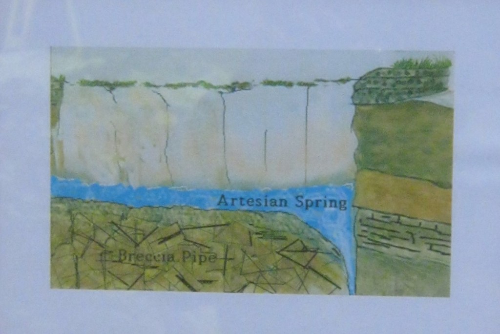 Pictured above, three different but gradual episodes of sedimentation filled the sinkhole over a period of approximately 750 years. During the Late Pleistocene, the sinkhole at Mammoth Site of Hot Springs formed when a cavern in the Minnelusa Limestone collapsed. This cavern collapse created a steep-sided sinkhole, that was about 20 m deep and 37 m by 46 m wide at the surface within a Pleistocene terrace underlain by Spearfish Shale. The sinkhole is the surface expression vertical breccia pipe provided a chimney-like path that allowed warm artesian water to percolate upward and fill the sinkhole with a steeply-sided pond.