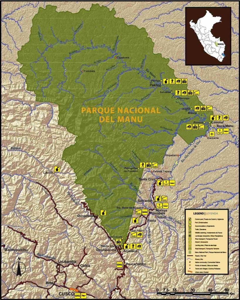 Manu has became famous for its possibilities to observe especially the fauna but also the flora of Amazonian rainforest.Chullpas are found across the Altiplano in Peru and Bolivia. The chullpas in Nina Marka are located between Cusco and Paucartambo (Peru). This archaeological site contains 17 chullpas of 2.5 meters of height. Higher chullpas are found in Sillustani near Puno in Peru.