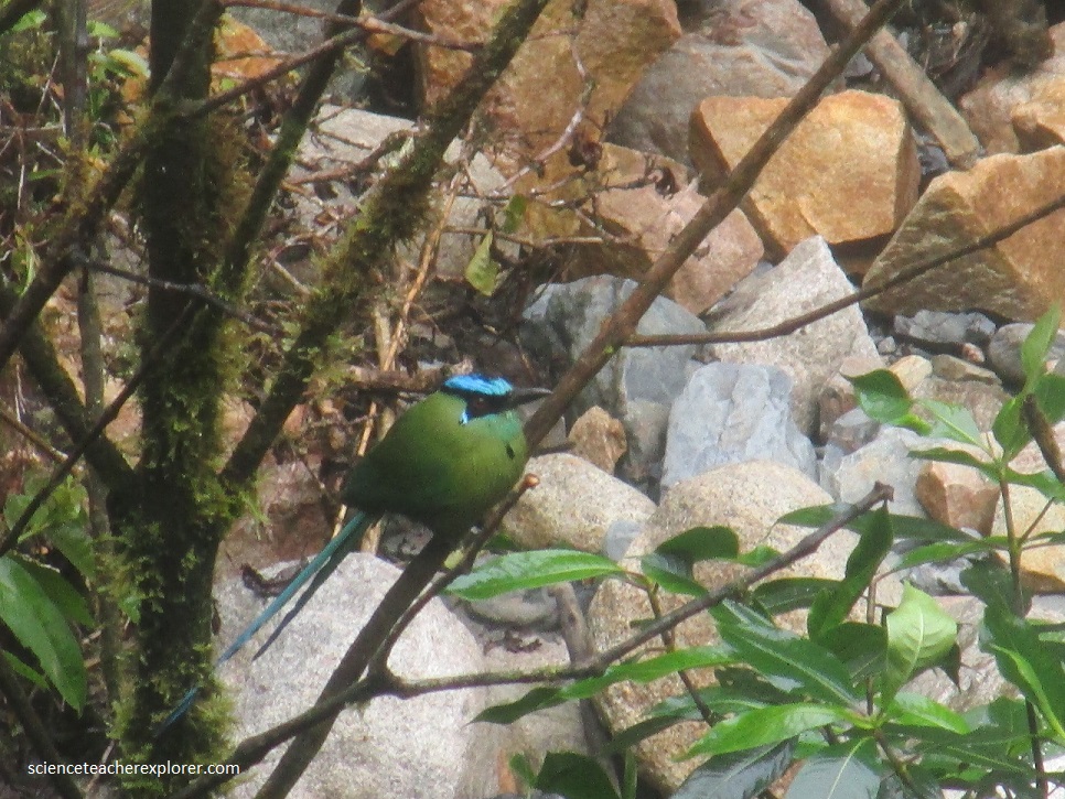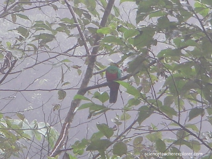 Dale Child, one of the biology teachers on the trip, waited his whole life to see a rare species of Quetzal bird. My local guide pointed one out on the first day. Quetzals are a primitive group of birds that is mostly pan-tropical in distribution. They can be found in locations of up to 3000 m elevation. All are notable for their beautiful mainly green colors, which are often glossy or metallic. The Trogon, Quetzals are characterized by their strongly graduated and square-tipped tails, their weak feet with two toes forward and two back, and their upright posture.