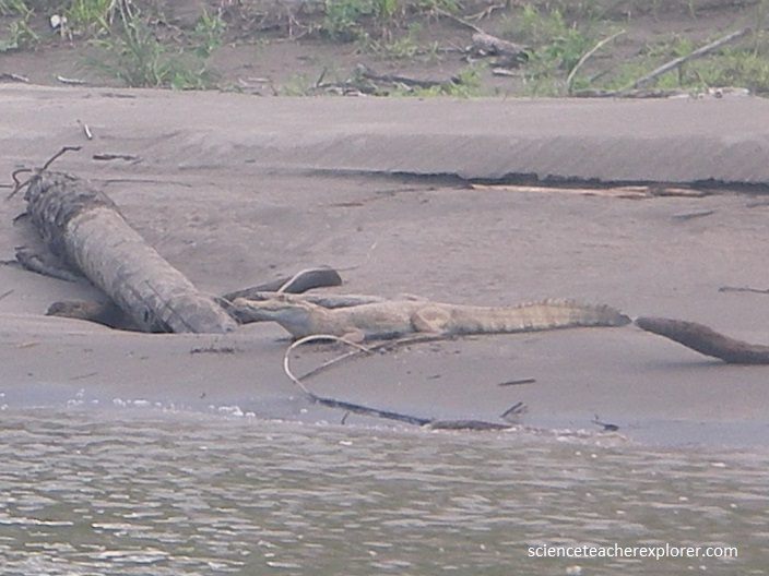 Further down the Madre de Dios river, near Puerto Colorado we see this this larger “White Caiman” sunning itself on the river beach.