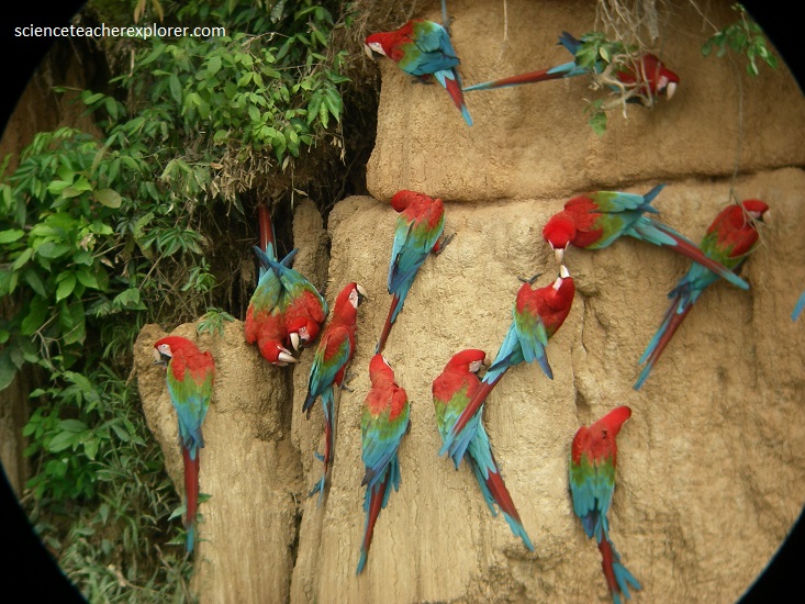In the morning we visited a place about 30 km downriver from the Manu Wildlife Center where a clay lick at Tamba Blanquilla attracts flocks of colorful parrots and macaws. The Manu River turns into the bigger Madre de Dios river at this site. The Tamba Blanquilla is a 10 m tall clay exposure in the Madre de Dios river bank. The birds arrive in strict order. Smaller birds such as blue-headed and mealy parrots arrive at dawn. The larger parrots and bright macaws pitch up between 8-10 am, and perch in the nearby trees for an hour or two before partaking of the clay. They use the kaolin mixture to neutralize the chemical defense poisons in their plant food. Below is the early morning arrival of the “Blue Headed Parrot”. Parrots are an anatomically homogeneous group of birds. You’ll notice in the brief video, that they are noisy, social, and heavy, hooked bills and yoke-toed feet.