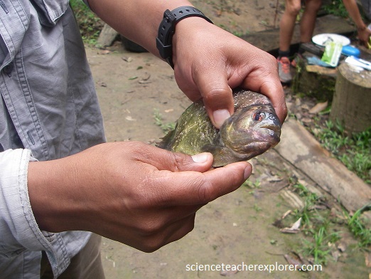 The Amazon basin and via Manu River is home for the infamous 35 cm piranha. Though they are widespread and , to put it mildly, extremely abundant, piranha are only potentially dangerous when water levels are low and food supply is poor, concentrating the already hungry predatory fish and putting any potential protein source at risk of attack. Piranhas are more beneficial to the ecosystem, keeping the waters clear of dying animals. When conditions are normal, piranha are of no danger to swimmers.