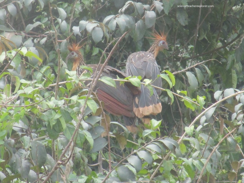 Flow dynamics of the river can become unstable (typically during the high-water period). During this instability, it is possible that the river will cut a new channel. this effectively isolates a meander and creates an “oxbow lake”. An oxbow lake is a habitat of essentially standing water, providing yet another kind of riverine habitat, where water stagnates rather than flows rapidly. These lakes are plentifully stocked with fish and rich in nutrients. This enables them to give life to other kind of animals and plants. The most well-known inhabitants of the oxbow-lakes are the giant otters and the black caimans. Many bird species live only on the oxbow lakes. Pictured below are Hoatzin, (oil birds) in the oxbow lake pictured above.
