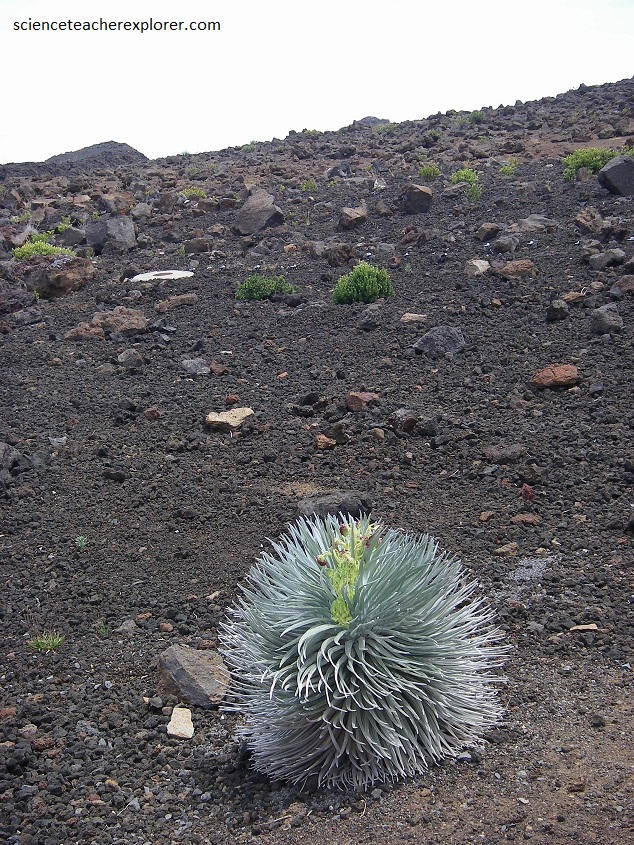 Pictured above, the silvery hairs, fleshy leaves, and low-growing rosette form of the Haleakala silversword allow it to survive in hot, dry climates like the aeolian desert cinder slopes of the Haleakala Crater. Silverswords live between 3 and 90 years or more. They flower once, sending up a spectacular flowering stalk, and then die soon afterward, scattering drying seeds to the wind.