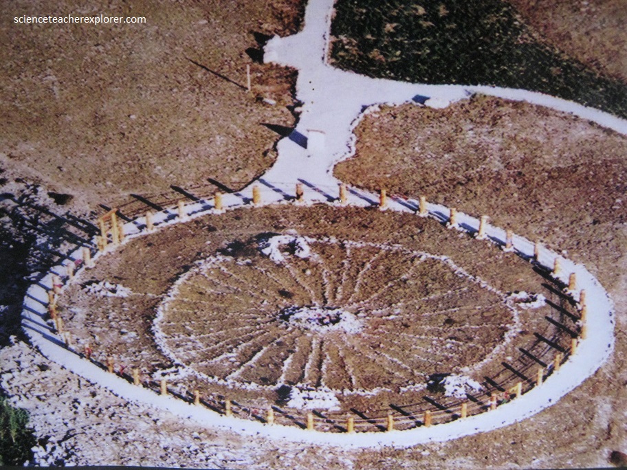The structure is located at an altitude of 2939 m, near the summit of Medicine Mountain. It is a pre-columbian structure, built from roughly loaf-sized stones gathered from the surrounding area. The structure consists of a circular rim, 24 m in diameter, 28 spokes extending from the rim to the center, and a series of seven stone circles (cairns). Cairn O is at the center of the structure and is about 3 m in diameter. Cairns A – F are at or near the rim, and are considerably smaller. The wheel has 28 spokes, the same number used in the roofs of ceremonial buildings such as the Lakota Sundance lodge. These always includes an entrance to the east, facing the rising Sun, and include 28 rafters for the 28 days in the lunar cycle. The number 28 is sacred to some of the Indian tribes because of its significance as the lunar month. In Bighorn’s case, could the special number 28 also refer to the helicial or dawn rising of Rigel 28 days past the Solstice, and Sirius another 28 past that.