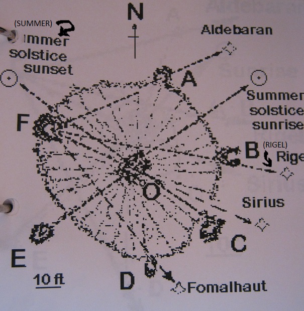 Pictured above, sighting from cairn E through the center hub (which may have supported a pole) marks the summer solstice sunrise. Sighting from C through the center marked the equivalent solstice sunset.