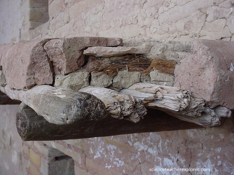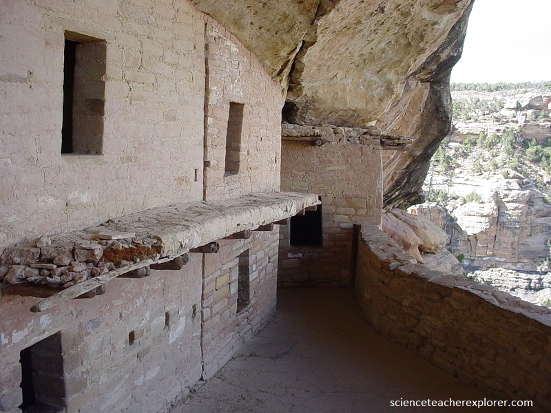 Pictured above, the balcony construction of poles covered with twigs or split juniper shakes set at right angles, the bark, and finally mud typifies roof construction employed by all the Ancient Pueblos.