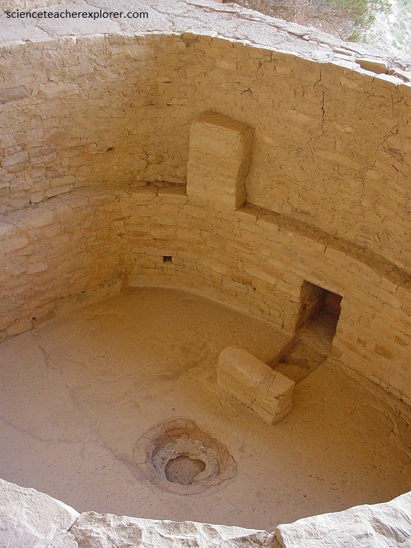 Even though no two of Cliff palace’s twenty-three kivas are exactly alike, they all follow a generalized pattern: circular in plan, generally dug beneath courtyard level so their roofs would form part of the courtyard, central fireplace, ventilator tunnel on the south side, a raised air deflector, and usually six masonry pilasters rising above an encircling banquette to support a cribbed log roof. {Example pictured above}