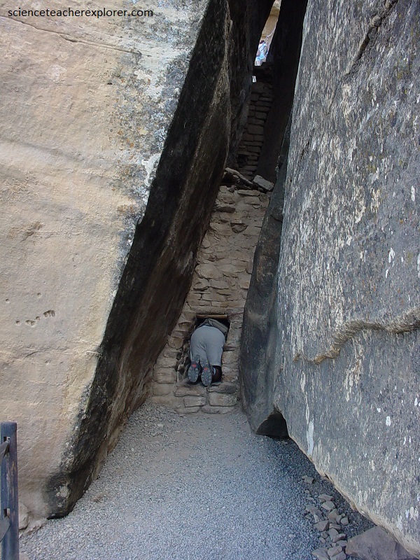 Pictured above, Balcony House is tucked beneath the cliff on the east side of Chapin Mesa overlooking Soda Canyon. Of all the cliff swellings on the Mesa Verde, this one displays the most defensive setting. After climbing up a steep toehold trail and traversing a narrow ledge, Becky and I had to crawl through 2 low tunnels behind the leaning boulder at the extreme left, (pictured below), then enter the ruin at the left end of the cave.