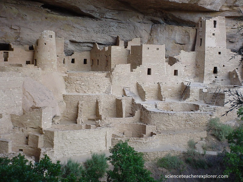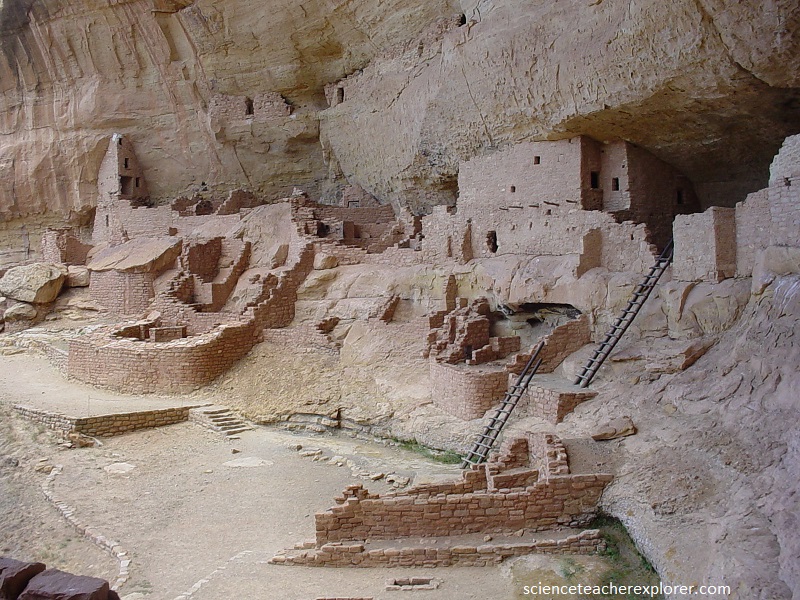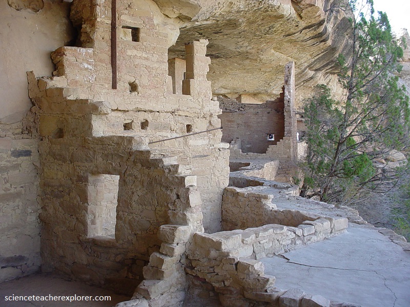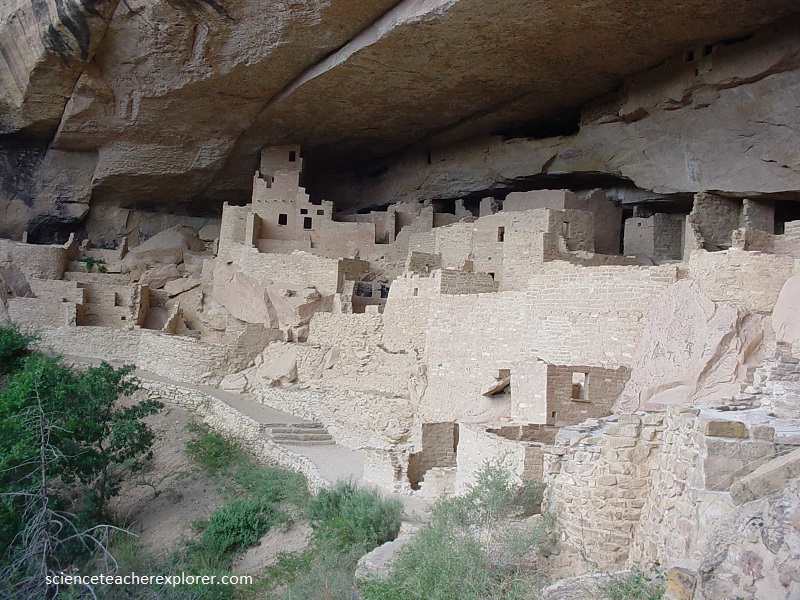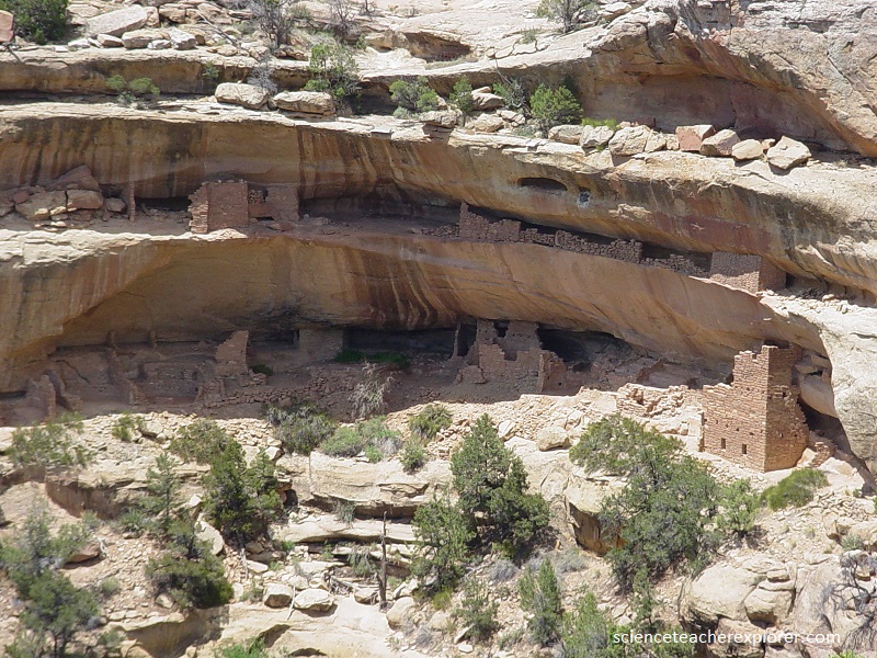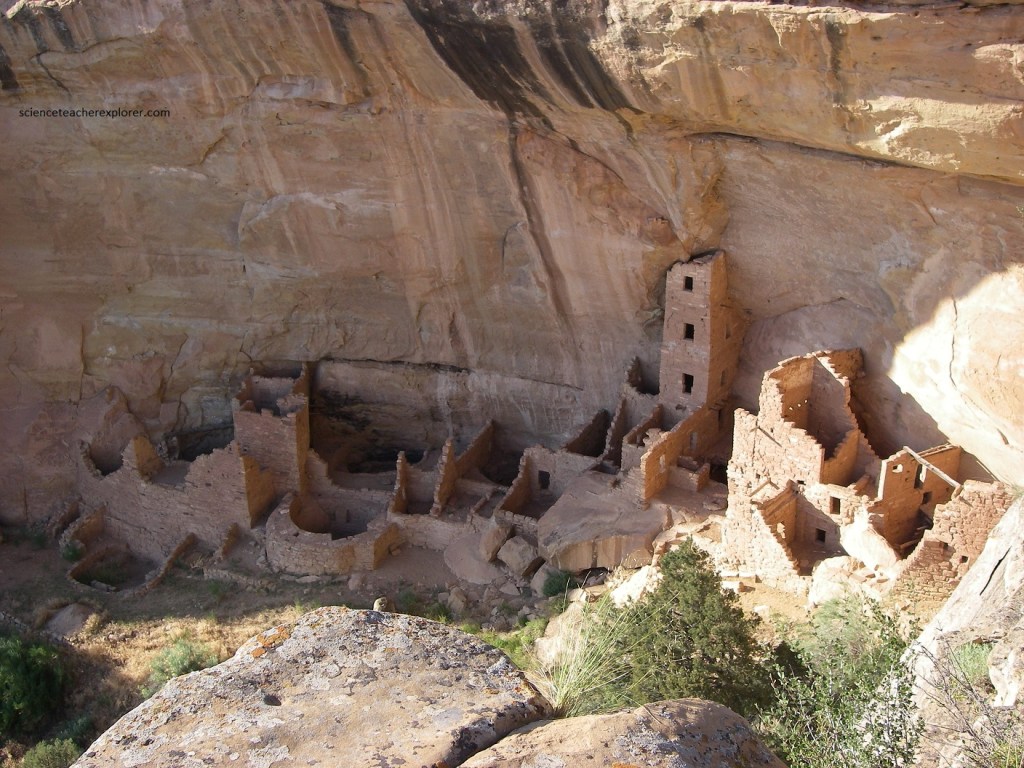Picture above, Spruce Tree House” village, occupied between 1200 and 1300 AD, is the best preserved of all Mesa Verde’s cliff dwellings, with three-story walls extending to the cave roof, many intact roofs and balconies, and painted plaster covering many wall surfaces.