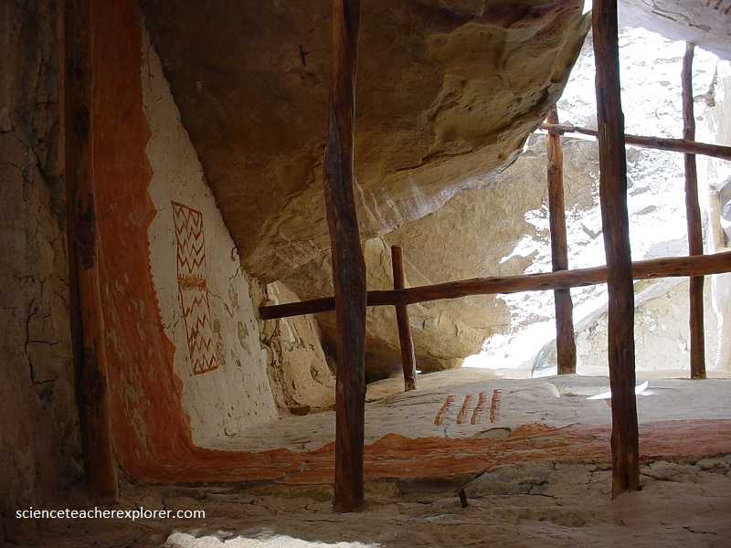 Painted interior walls on the third floor of a four-story building in Cliff Palace, (pictured above). The upper portion of the wall has been painted white, the lower portion red, with red triangles extending upward as if representing mountains on the horizon. Rows of red dots run between the triangles. Both rectangular patterns painted in red on the white upper walls resemble textile patterns. Fancy decorations!