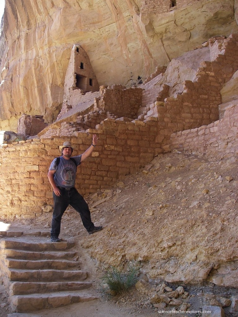 Pictured above, Square Tower House lies beneath a high shallow overhang in an alcove in the west wall of Chapin Mesa below Twin Trees. It had 7 kin kivas and more than 70 rooms. Several rooms were perched high in a cliff crack above and to the right of the cliff dwelling. Excavators called this the “crow’s nest”. The nearest trail to the mesa top led out of the right side of the shelter along the base of the cliff and through a narrow crack behind a large boulder leaning against the cliff. {This is where I took the picture}.