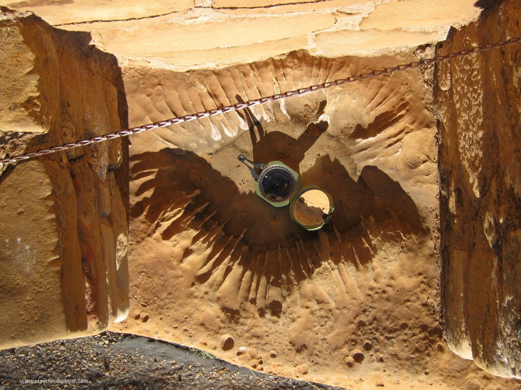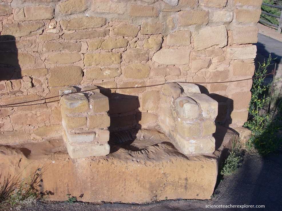 Pictured above, there is an eroded stone basin with small indentations at the southwest corner of Sun Temple, next to the wall. This feature may have served as a sun dial to mark the change of seasons.