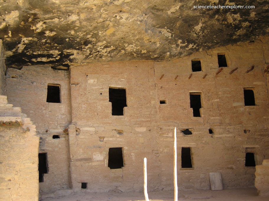 Pictured above, upper ledge rooms on the left of the cave were primarily for storage and were reached by ladder from the roofs of rooms below. A single long crude wall riddled with peek holes encloses space on the high ledge above the center of the ruin also.
