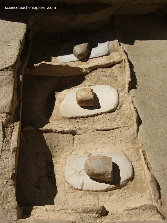 While walking down to the “Spruce Tree House” Ruins, Becky and I, discerned individual workmanship of different stone masons from wall to wall. Pictured below, the Anasazi (Ancient Pueblo) often sun dried their vegetables. Many food items were stone-ground, using grinding stones [metate and mano]. Seeds were parched in hot coals and ground into meal. Pine nuts were ground into a paste.
