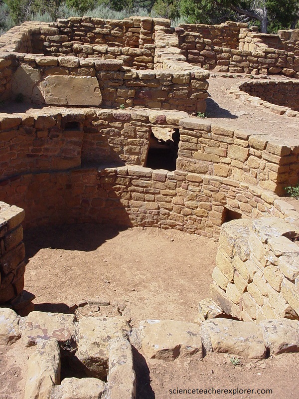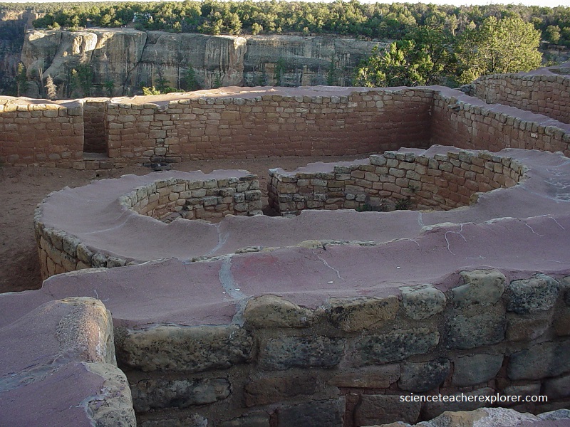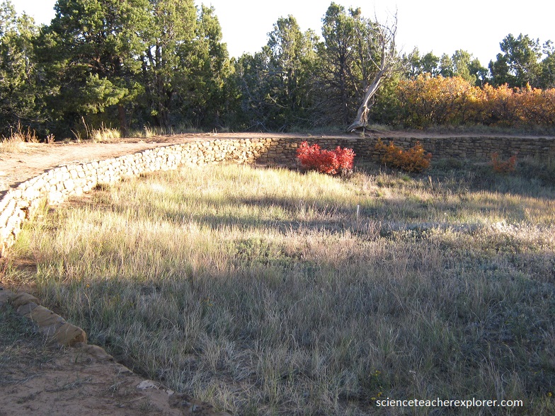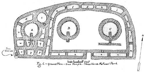 Pictured below, the “Sun Temple” was constructed with two concentric D-shaped, rubble-cored walls divided into compartments which enclosed a pair of kivas. on the west side of the D-shaped structure is an extension with a third kiva, other compartments, and a circular building that probably was the base of a tower.